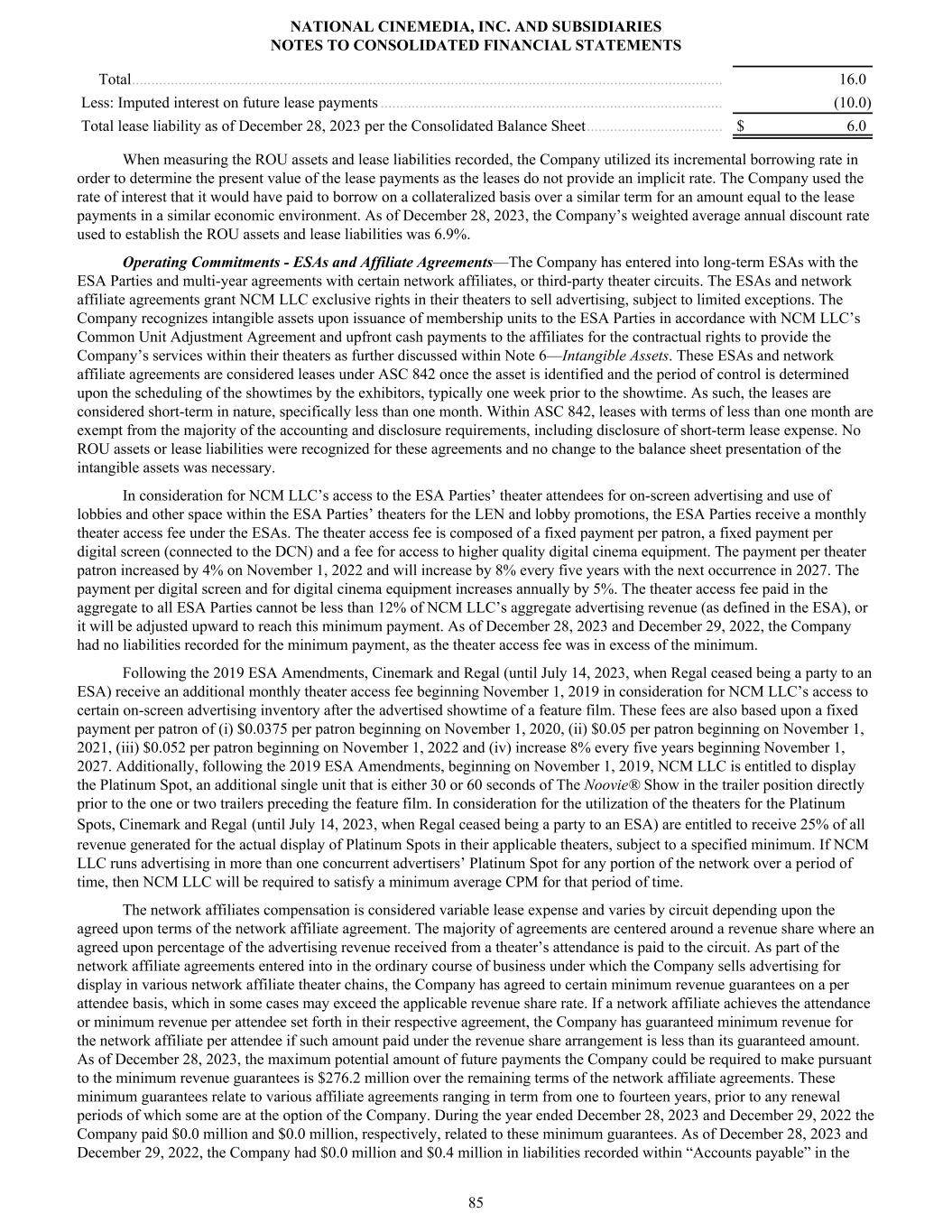 Total ........................................................................................................................................................ 16.0 Less: Imputed interest on future lease payments ........................................................................................ (10.0) Total lease liability as of December 28, 2023 per the Consolidated Balance Sheet ................................... $ 6.0 When measuring the ROU assets and lease liabilities recorded, the Company utilized its incremental borrowing rate in order to determine the present value of the lease payments as the leases do not provide an implicit rate. The Company used the rate of interest that it would have paid to borrow on a collateralized basis over a similar term for an amount equal to the lease payments in a similar economic environment. As of December 28, 2023, the Company’s weighted average annual discount rate used to establish the ROU assets and lease liabilities was 6.9%. Operating Commitments - ESAs and Affiliate Agreements—The Company has entered into long-term ESAs with the ESA Parties and multi-year agreements with certain network affiliates, or third-party theater circuits. The ESAs and network affiliate agreements grant NCM LLC exclusive rights in their theaters to sell advertising, subject to limited exceptions. The Company recognizes intangible assets upon issuance of membership units to the ESA Parties in accordance with NCM LLC’s Common Unit Adjustment Agreement and upfront cash payments to the affiliates for the contractual rights to provide the Company’s services within their theaters as further discussed within Note 6—Intangible Assets. These ESAs and network affiliate agreements are considered leases under ASC 842 once the asset is identified and the period of control is determined upon the scheduling of the showtimes by the exhibitors, typically one week prior to the showtime. As such, the leases are considered short-term in nature, specifically less than one month. Within ASC 842, leases with terms of less than one month are exempt from the majority of the accounting and disclosure requirements, including disclosure of short-term lease expense. No ROU assets or lease liabilities were recognized for these agreements and no change to the balance sheet presentation of the intangible assets was necessary. In consideration for NCM LLC’s access to the ESA Parties’ theater attendees for on-screen advertising and use of lobbies and other space within the ESA Parties’ theaters for the LEN and lobby promotions, the ESA Parties receive a monthly theater access fee under the ESAs. The theater access fee is composed of a fixed payment per patron, a fixed payment per digital screen (connected to the DCN) and a fee for access to higher quality digital cinema equipment. The payment per theater patron increased by 4% on November 1, 2022 and will increase by 8% every five years with the next occurrence in 2027. The payment per digital screen and for digital cinema equipment increases annually by 5%. The theater access fee paid in the aggregate to all ESA Parties cannot be less than 12% of NCM LLC’s aggregate advertising revenue (as defined in the ESA), or it will be adjusted upward to reach this minimum payment. As of December 28, 2023 and December 29, 2022, the Company had no liabilities recorded for the minimum payment, as the theater access fee was in excess of the minimum. Following the 2019 ESA Amendments, Cinemark and Regal (until July 14, 2023, when Regal ceased being a party to an ESA) receive an additional monthly theater access fee beginning November 1, 2019 in consideration for NCM LLC’s access to certain on-screen advertising inventory after the advertised showtime of a feature film. These fees are also based upon a fixed payment per patron of (i) $0.0375 per patron beginning on November 1, 2020, (ii) $0.05 per patron beginning on November 1, 2021, (iii) $0.052 per patron beginning on November 1, 2022 and (iv) increase 8% every five years beginning November 1, 2027. Additionally, following the 2019 ESA Amendments, beginning on November 1, 2019, NCM LLC is entitled to display the Platinum Spot, an additional single unit that is either 30 or 60 seconds of The Noovie® Show in the trailer position directly prior to the one or two trailers preceding the feature film. In consideration for the utilization of the theaters for the Platinum Spots, Cinemark and Regal (until July 14, 2023, when Regal ceased being a party to an ESA) are entitled to receive 25% of all revenue generated for the actual display of Platinum Spots in their applicable theaters, subject to a specified minimum. If NCM LLC runs advertising in more than one concurrent advertisers’ Platinum Spot for any portion of the network over a period of time, then NCM LLC will be required to satisfy a minimum average CPM for that period of time. The network affiliates compensation is considered variable lease expense and varies by circuit depending upon the agreed upon terms of the network affiliate agreement. The majority of agreements are centered around a revenue share where an agreed upon percentage of the advertising revenue received from a theater’s attendance is paid to the circuit. As part of the network affiliate agreements entered into in the ordinary course of business under which the Company sells advertising for display in various network affiliate theater chains, the Company has agreed to certain minimum revenue guarantees on a per attendee basis, which in some cases may exceed the applicable revenue share rate. If a network affiliate achieves the attendance or minimum revenue per attendee set forth in their respective agreement, the Company has guaranteed minimum revenue for the network affiliate per attendee if such amount paid under the revenue share arrangement is less than its guaranteed amount. As of December 28, 2023, the maximum potential amount of future payments the Company cou