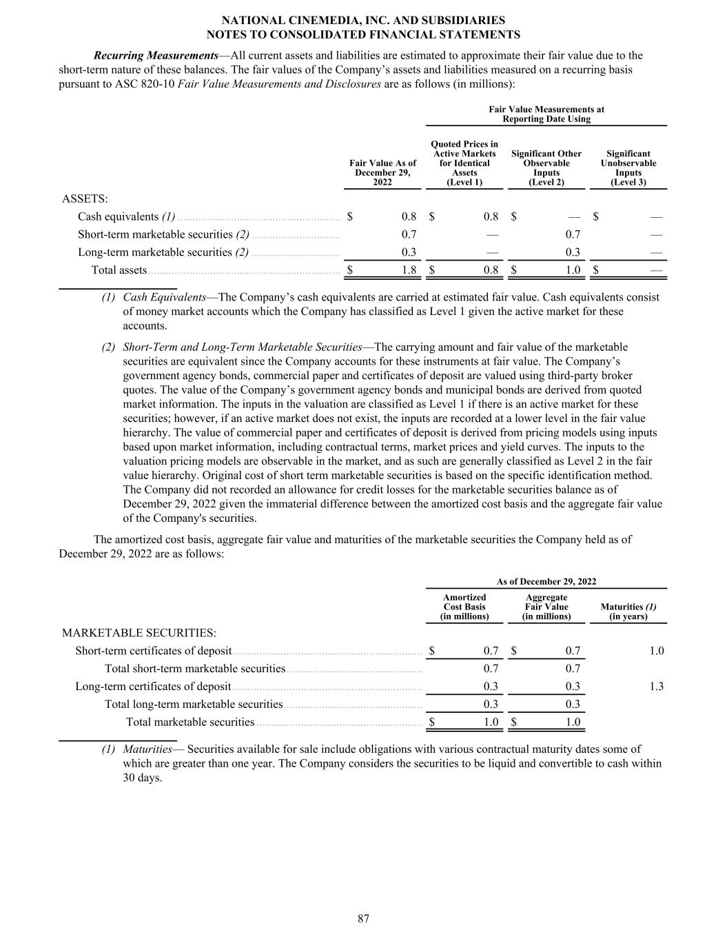 Recurring Measurements—All current assets and liabilities are estimated to approximate their fair value due to the short-term nature of these balances. The fair values of the Company’s assets and liabilities measured on a recurring basis pursuant to ASC 820-10 Fair Value Measurements and Disclosures are as follows (in millions): Fair Value Measurements at Reporting Date Using Fair Value As of December 29, 2022 Quoted Prices in Active Markets for Identical Assets (Level 1) Significant Other Observable Inputs (Level 2) Significant Unobservable Inputs (Level 3) ASSETS: Cash equivalents (1) ....................................................... $ 0.8 $ 0.8 $ — $ — Short-term marketable securities (2) .............................. 0.7 — 0.7 — Long-term marketable securities (2) .............................. 0.3 — 0.3 — Total assets ................................................................. $ 1.8 $ 0.8 $ 1.0 $ — (1) Cash Equivalents—The Company’s cash equivalents are carried at estimated fair value. Cash equivalents consist of money market accounts which the Company has classified as Level 1 given the active market for these accounts. (2) Short-Term and Long-Term Marketable Securities—The carrying amount and fair value of the marketable securities are equivalent since the Company accounts for these instruments at fair value. The Company’s government agency bonds, commercial paper and certificates of deposit are valued using third-party broker quotes. The value of the Company’s government agency bonds and municipal bonds are derived from quoted market information. The inputs in the valuation are classified as Level 1 if there is an active market for these securities; however, if an active market does not exist, the inputs are recorded at a lower level in the fair value hierarchy. The value of commercial paper and certificates of deposit is derived from pricing models using inputs based upon market information, including contractual terms, market prices and yield curves. The inputs to the valuation pricing models are observable in the market, and as such are generally classified as Level 2 in the fair value hierarchy. Original cost of short term marketable securities is based on the specific identification method. The Company did not recorded an allowance for credit losses for the marketable securities balance as of December 29, 2022 given the immaterial difference between the amortized cost basis and the aggregate fair value of the Company's securities. The amortized cost basis, aggregate fair value and maturities of the marketable securities the Company held as of December 29, 2022 are as follows: As of December 29, 2022 Amortized Cost Basis (in millions) Aggregate Fair Value (in millions) Maturities (1) (in years) MARKETABLE SECURITIES: Short-term certificates of deposit ................................................................ $ 0.7 $ 0.7 1.0 Total short-term marketable securities .............................................. 0.7 0.7 Long-term certificates of deposit ................................................................ 0.3 0.3 1.3 Total long-term marketable securities ............................................... 0.3 0.3 Total marketable securities ........................................................ $ 1.0 $ 1.0 (1) Maturities— Securities available for sale include obligations with various contractual maturity dates some of which are greater than one year. The Company considers the securities to be liquid and convertible to cash within 30 days. NATIONAL CINEMEDIA, INC. AND SUBSIDIARIES NOTES TO CONSOLIDATED FINANCIAL STATEMENTS 87