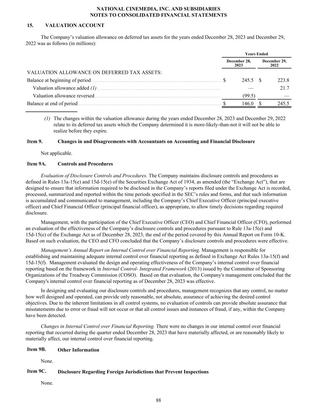 15. VALUATION ACCOUNT The Company’s valuation allowance on deferred tax assets for the years ended December 28, 2023 and December 29, 2022 was as follows (in millions): Years Ended December 28, 2023 December 29, 2022 VALUATION ALLOWANCE ON DEFERRED TAX ASSETS: Balance at beginning of period .................................................................................................... $ 245.5 $ 223.8 Valuation allowance added (1) ............................................................................................... — 21.7 Valuation allowance reversed ................................................................................................. (99.5) — Balance at end of period .............................................................................................................. $ 146.0 $ 245.5 (1) The changes within the valuation allowance during the years ended December 28, 2023 and December 29, 2022 relate to its deferred tax assets which the Company determined it is more-likely-than-not it will not be able to realize before they expire. Item 9. Changes in and Disagreements with Accountants on Accounting and Financial Disclosure Not applicable. Item 9A. Controls and Procedures Evaluation of Disclosure Controls and Procedures. The Company maintains disclosure controls and procedures as defined in Rules 13a-15(e) and 15d-15(e) of the Securities Exchange Act of 1934, as amended (the “Exchange Act”), that are designed to ensure that information required to be disclosed in the Company’s reports filed under the Exchange Act is recorded, processed, summarized and reported within the time periods specified in the SEC’s rules and forms, and that such information is accumulated and communicated to management, including the Company’s Chief Executive Officer (principal executive officer) and Chief Financial Officer (principal financial officer), as appropriate, to allow timely decisions regarding required disclosure. Management, with the participation of the Chief Executive Officer (CEO) and Chief Financial Officer (CFO), performed an evaluation of the effectiveness of the Company’s disclosure controls and procedures pursuant to Rule 13a-15(e) and 15d-15(e) of the Exchange Act as of December 28, 2023, the end of the period covered by this Annual Report on Form 10-K. Based on such evaluation, the CEO and CFO concluded that the Company’s disclosure controls and procedures were effective. Management’s Annual Report on Internal Control over Financial Reporting. Management is responsible for establishing and maintaining adequate internal control over financial reporting as defined in Exchange Act Rules 13a-15(f) and 15d-15(f). Management evaluated the design and operating effectiveness of the Company’s internal control over financial reporting based on the framework in Internal Control- Integrated Framework (2013) issued by the Committee of Sponsoring Organizations of the Treadway Commission (COSO). Based on that evaluation, the Company's management concluded that the Company's internal control over financial reporting as of December 28, 2023 was effective. In designing and evaluating our disclosure controls and procedures, management recognizes that any control, no matter how well designed and operated, can provide only reasonable, not absolute, assurance of achieving the desired control objectives. Due to the inherent limitations in all control systems, no evaluation of controls can provide absolute assurance that misstatements due to error or fraud will not occur or that all control issues and instances of fraud, if any, within the Company have been detected. Changes in Internal Control over Financial Reporting. There were no changes in our internal control over financial reporting that occurred during the quarter ended December 28, 2023 that have materially affected, or are reasonably likely to materially affect, our internal control over financial reporting. Item 9B. Other Information None. Item 9C. Disclosure Regarding Foreign Jurisdictions that Prevent Inspections None. NATIONAL CINEMEDIA, INC. AND SUBSIDIARIES NOTES TO CONSOLIDATED FINANCIAL STATEMENTS 88