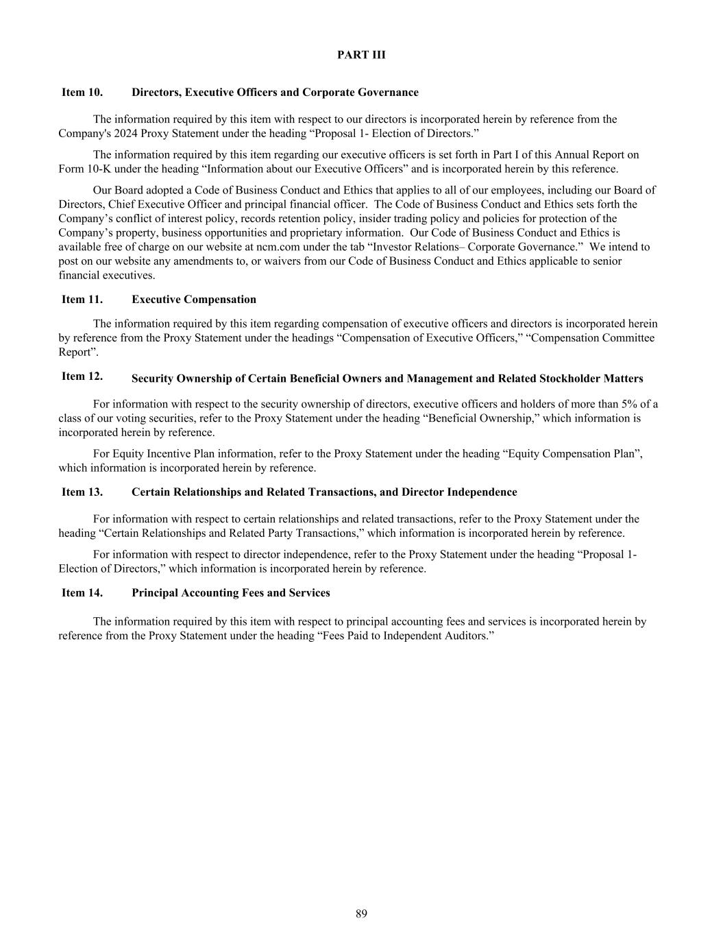 PART III Item 10. Directors, Executive Officers and Corporate Governance The information required by this item with respect to our directors is incorporated herein by reference from the Company's 2024 Proxy Statement under the heading “Proposal 1- Election of Directors.” The information required by this item regarding our executive officers is set forth in Part I of this Annual Report on Form 10-K under the heading “Information about our Executive Officers” and is incorporated herein by this reference. Our Board adopted a Code of Business Conduct and Ethics that applies to all of our employees, including our Board of Directors, Chief Executive Officer and principal financial officer. The Code of Business Conduct and Ethics sets forth the Company’s conflict of interest policy, records retention policy, insider trading policy and policies for protection of the Company’s property, business opportunities and proprietary information. Our Code of Business Conduct and Ethics is available free of charge on our website at ncm.com under the tab “Investor Relations– Corporate Governance.” We intend to post on our website any amendments to, or waivers from our Code of Business Conduct and Ethics applicable to senior financial executives. Item 11. Executive Compensation The information required by this item regarding compensation of executive officers and directors is incorporated herein by reference from the Proxy Statement under the headings “Compensation of Executive Officers,” “Compensation Committee Report”. Item 12. Security Ownership of Certain Beneficial Owners and Management and Related Stockholder Matters For information with respect to the security ownership of directors, executive officers and holders of more than 5% of a class of our voting securities, refer to the Proxy Statement under the heading “Beneficial Ownership,” which information is incorporated herein by reference. For Equity Incentive Plan information, refer to the Proxy Statement under the heading “Equity Compensation Plan”, which information is incorporated herein by reference. Item 13. Certain Relationships and Related Transactions, and Director Independence For information with respect to certain relationships and related transactions, refer to the Proxy Statement under the heading “Certain Relationships and Related Party Transactions,” which information is incorporated herein by reference. For information with respect to director independence, refer to the Proxy Statement under the heading “Proposal 1- Election of Directors,” which information is incorporated herein by reference. Item 14. Principal Accounting Fees and Services The information required by this item with respect to principal accounting fees and services is incorporated herein by reference from the Proxy Statement under the heading “Fees Paid to Independent Auditors.” 89
