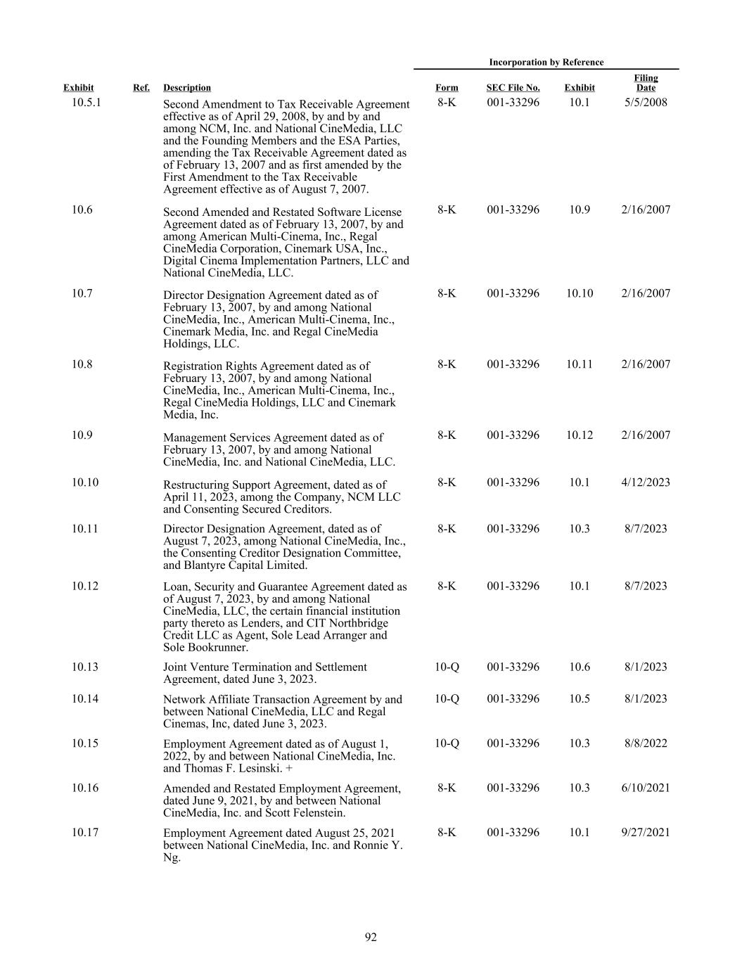 10.5.1 Second Amendment to Tax Receivable Agreement effective as of April 29, 2008, by and by and among NCM, Inc. and National CineMedia, LLC and the Founding Members and the ESA Parties, amending the Tax Receivable Agreement dated as of February 13, 2007 and as first amended by the First Amendment to the Tax Receivable Agreement effective as of August 7, 2007. 8-K 001-33296 10.1 5/5/2008 10.6 Second Amended and Restated Software License Agreement dated as of February 13, 2007, by and among American Multi-Cinema, Inc., Regal CineMedia Corporation, Cinemark USA, Inc., Digital Cinema Implementation Partners, LLC and National CineMedia, LLC. 8-K 001-33296 10.9 2/16/2007 10.7 Director Designation Agreement dated as of February 13, 2007, by and among National CineMedia, Inc., American Multi-Cinema, Inc., Cinemark Media, Inc. and Regal CineMedia Holdings, LLC. 8-K 001-33296 10.10 2/16/2007 10.8 Registration Rights Agreement dated as of February 13, 2007, by and among National CineMedia, Inc., American Multi-Cinema, Inc., Regal CineMedia Holdings, LLC and Cinemark Media, Inc. 8-K 001-33296 10.11 2/16/2007 10.9 Management Services Agreement dated as of February 13, 2007, by and among National CineMedia, Inc. and National CineMedia, LLC. 8-K 001-33296 10.12 2/16/2007 10.10 Restructuring Support Agreement, dated as of April 11, 2023, among the Company, NCM LLC and Consenting Secured Creditors. 8-K 001-33296 10.1 4/12/2023 10.11 Director Designation Agreement, dated as of August 7, 2023, among National CineMedia, Inc., the Consenting Creditor Designation Committee, and Blantyre Capital Limited. 8-K 001-33296 10.3 8/7/2023 10.12 Loan, Security and Guarantee Agreement dated as of August 7, 2023, by and among National CineMedia, LLC, the certain financial institution party thereto as Lenders, and CIT Northbridge Credit LLC as Agent, Sole Lead Arranger and Sole Bookrunner. 8-K 001-33296 10.1 8/7/2023 10.13 Joint Venture Termination and Settlement Agreement, dated June 3, 2023. 10-Q 001-33296 10.6 8/1/2023 10.14 Network Affiliate Transaction Agreement by and between National CineMedia, LLC and Regal Cinemas, Inc, dated June 3, 2023. 10-Q 001-33296 10.5 8/1/2023 10.15 Employment Agreement dated as of August 1, 2022, by and between National CineMedia, Inc. and Thomas F. Lesinski. + 10-Q 001-33296 10.3 8/8/2022 10.16 Amended and Restated Employment Agreement, dated June 9, 2021, by and between National CineMedia, Inc. and Scott Felenstein. 8-K 001-33296 10.3 6/10/2021 10.17 Employment Agreement dated August 25, 2021 between National CineMedia, Inc. and Ronnie Y. Ng. 8-K 001-33296 10.1 9/27/2021 Incorporation by Reference Exhibit Ref. Description Form SEC File No. Exhibit Filing Date 92