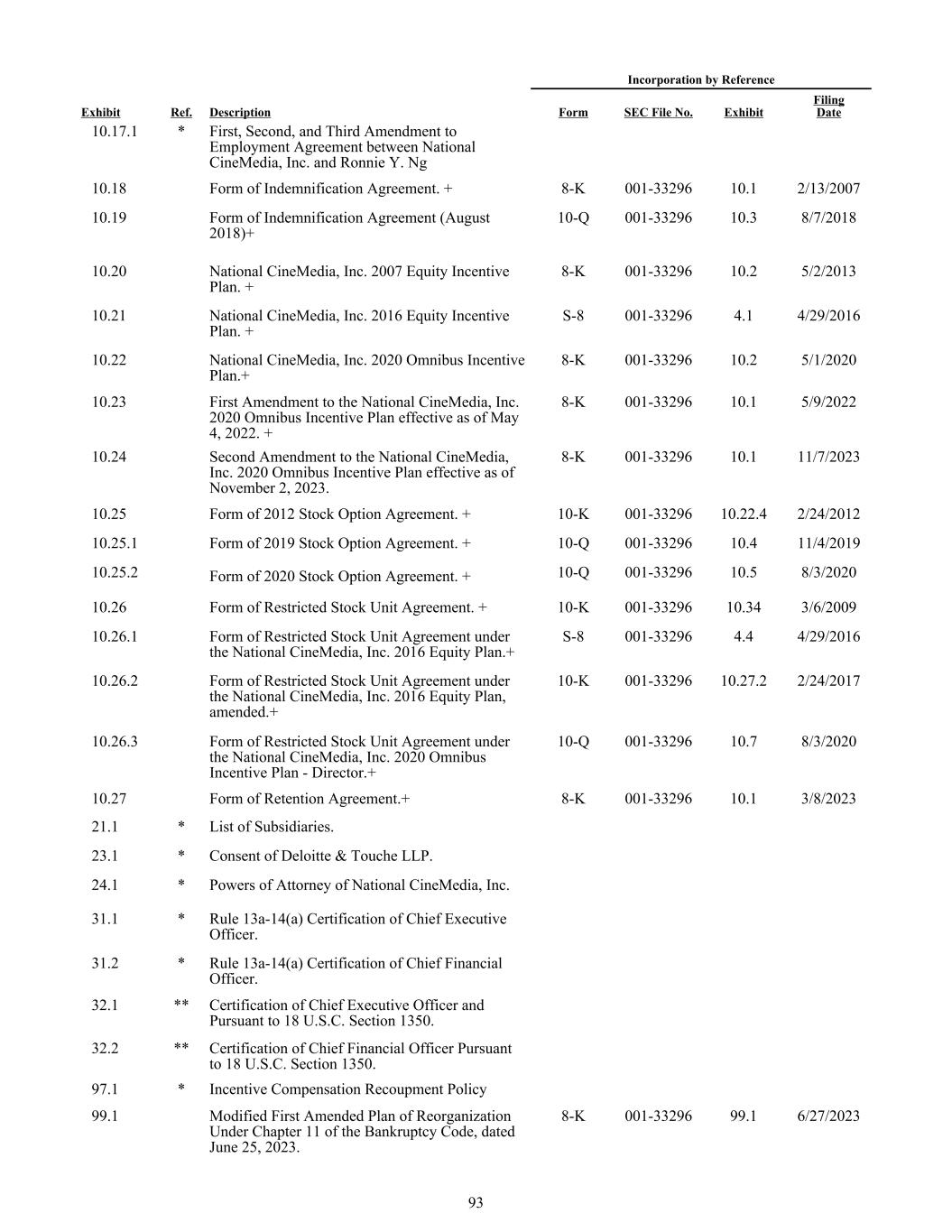 10.17.1 * First, Second, and Third Amendment to Employment Agreement between National CineMedia, Inc. and Ronnie Y. Ng 10.18 Form of Indemnification Agreement. + 8-K 001-33296 10.1 2/13/2007 10.19 Form of Indemnification Agreement (August 2018)+ 10-Q 001-33296 10.3 8/7/2018 10.20 National CineMedia, Inc. 2007 Equity Incentive Plan. + 8-K 001-33296 10.2 5/2/2013 10.21 National CineMedia, Inc. 2016 Equity Incentive Plan. + S-8 001-33296 4.1 4/29/2016 10.22 National CineMedia, Inc. 2020 Omnibus Incentive Plan.+ 8-K 001-33296 10.2 5/1/2020 10.23 First Amendment to the National CineMedia, Inc. 2020 Omnibus Incentive Plan effective as of May 4, 2022. + 8-K 001-33296 10.1 5/9/2022 10.24 Second Amendment to the National CineMedia, Inc. 2020 Omnibus Incentive Plan effective as of November 2, 2023. 8-K 001-33296 10.1 11/7/2023 10.25 Form of 2012 Stock Option Agreement. + 10-K 001-33296 10.22.4 2/24/2012 10.25.1 Form of 2019 Stock Option Agreement. + 10-Q 001-33296 10.4 11/4/2019 10.25.2 Form of 2020 Stock Option Agreement. + 10-Q 001-33296 10.5 8/3/2020 10.26 Form of Restricted Stock Unit Agreement. + 10-K 001-33296 10.34 3/6/2009 10.26.1 Form of Restricted Stock Unit Agreement under the National CineMedia, Inc. 2016 Equity Plan.+ S-8 001-33296 4.4 4/29/2016 10.26.2 Form of Restricted Stock Unit Agreement under the National CineMedia, Inc. 2016 Equity Plan, amended.+ 10-K 001-33296 10.27.2 2/24/2017 10.26.3 Form of Restricted Stock Unit Agreement under the National CineMedia, Inc. 2020 Omnibus Incentive Plan - Director.+ 10-Q 001-33296 10.7 8/3/2020 10.27 Form of Retention Agreement.+ 8-K 001-33296 10.1 3/8/2023 21.1 * List of Subsidiaries. 23.1 * Consent of Deloitte & Touche LLP. 24.1 * Powers of Attorney of National CineMedia, Inc. 31.1 * Rule 13a-14(a) Certification of Chief Executive Officer. 31.2 * Rule 13a-14(a) Certification of Chief Financial Officer. 32.1 ** Certification of Chief Executive Officer and Pursuant to 18 U.S.C. Section 1350. 32.2 ** Certification of Chief Financial Officer Pursuant to 18 U.S.C. Section 1350. 97.1 * Incentive Compensation Recoupment Policy 99.1 Modified First Amended Plan of Reorganization Under Chapter 11 of the Bankruptcy Code, dated June 25, 2023. 8-K 001-33296 99.1 6/27/2023 Incorporation by Reference Exhibit Ref. Description Form SEC File No. Exhibit Filing Date 93