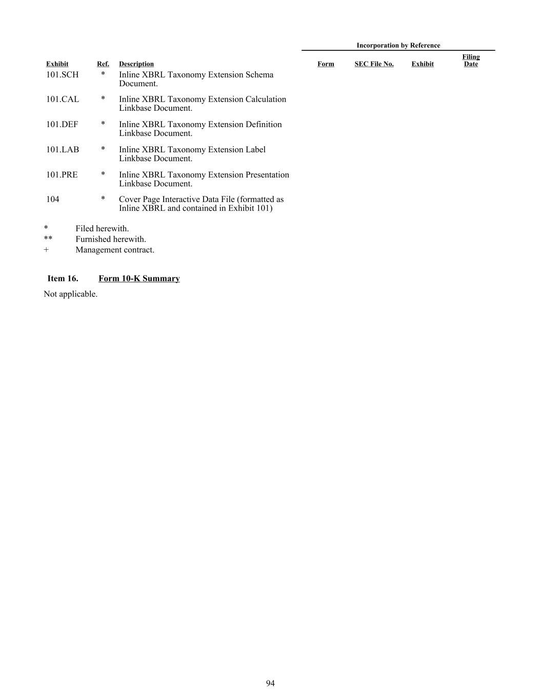 101.SCH * Inline XBRL Taxonomy Extension Schema Document. 101.CAL * Inline XBRL Taxonomy Extension Calculation Linkbase Document. 101.DEF * Inline XBRL Taxonomy Extension Definition Linkbase Document. 101.LAB * Inline XBRL Taxonomy Extension Label Linkbase Document. 101.PRE * Inline XBRL Taxonomy Extension Presentation Linkbase Document. 104 * Cover Page Interactive Data File (formatted as Inline XBRL and contained in Exhibit 101) Incorporation by Reference Exhibit Ref. Description Form SEC File No. Exhibit Filing Date * Filed herewith. ** Furnished herewith. + Management contract. Item 16. Form 10-K Summary Not applicable. 94