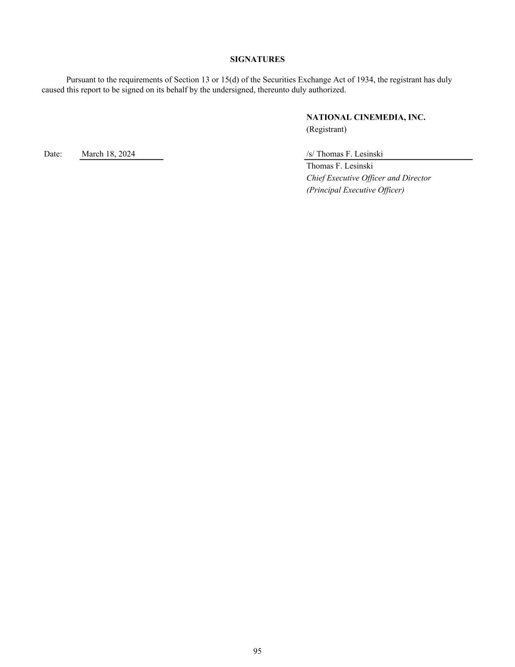 SIGNATURES Pursuant to the requirements of Section 13 or 15(d) of the Securities Exchange Act of 1934, the registrant has duly caused this report to be signed on its behalf by the undersigned, thereunto duly authorized. NATIONAL CINEMEDIA, INC. (Registrant) Date: March 18, 2024 /s/ Thomas F. Lesinski Thomas F. Lesinski Chief Executive Officer and Director (Principal Executive Officer) 95