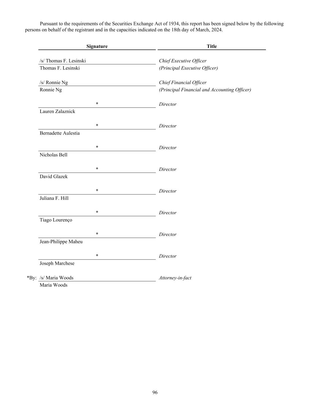 Pursuant to the requirements of the Securities Exchange Act of 1934, this report has been signed below by the following persons on behalf of the registrant and in the capacities indicated on the 18th day of March, 2024. Signature Title /s/ Thomas F. Lesinski Chief Executive Officer Thomas F. Lesinski (Principal Executive Officer) /s/ Ronnie Ng Chief Financial Officer Ronnie Ng (Principal Financial and Accounting Officer) * Director Lauren Zalaznick * Director Bernadette Aulestia * Director Nicholas Bell * Director David Glazek * Director Juliana F. Hill * Director Tiago Lourenço * Director Jean-Philippe Maheu * Director Joseph Marchese *By: /s/ Maria Woods Attorney-in-fact Maria Woods 96