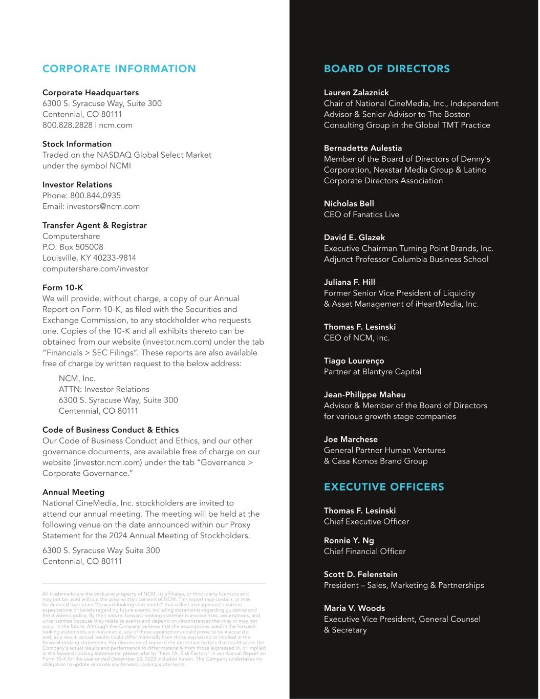 may not be used without the prior written consent of NCM. This report may contain, or may expectations or beliefs regarding future events, including statements regarding guidance and the dividend policy. By their nature, forward-looking statements involve risks, assumptions, and uncertainties because they relate to events and depend on circumstances that may or may not occur in the future. Although the Company believes that the assumptions used in the forward- looking statements are reasonable, any of these assumptions could prove to be inaccurate and, as a result, actual results could differ materially from those expressed or implied in the forward-looking statements. For discussion of some of the important factors that could cause the Company’s actual results and performance to differ materially from those expressed in, or implied in the forward-looking statements, please refer to “Item 1A. Risk Factors” in our Annual Report on Form 10-K for the year ended December 28, 2023 included herein. The Company undertakes no obligation to update or revise any forward-looking statements. CORPORATE INFORMATION Corporate Headquarters 6300 S. Syracuse Way, Suite 300 Centennial, CO 80111 800.828.2828 | ncm.com Stock Information Traded on the NASDAQ Global Select Market under the symbol NCMI Investor Relations Email: investors@ncm.com Transfer Agent & Registrar Computershare P.O. Box 505008 computershare.com/investor Form 10-K We will provide, without charge, a copy of our Annual Exchange Commission, to any stockholder who requests one. Copies of the 10-K and all exhibits thereto can be obtained from our website (investor.ncm.com) under the tab “Financials > SEC Filings”. These reports are also available free of charge by written request to the below address: NCM, Inc. ATTN: Investor Relations 6300 S. Syracuse Way, Suite 300 Centennial, CO 80111 Code of Business Conduct & Ethics Our Code of Business Conduct and Ethics, and our other governance documents, are available free of charge on our website (investor.ncm.com) under the tab “Governance > Corporate Governance.” Annual Meeting National CineMedia, Inc. stockholders are invited to attend our annual meeting. The meeting will be held at the following venue on the date announced within our Proxy Statement for the 2024 Annual Meeting of Stockholders. 6300 S. Syracuse Way Suite 300 Centennial, CO 80111 BOARD OF DIRECTORS Lauren Zalaznick Chair of National CineMedia, Inc., Independent Advisor & Senior Advisor to The Boston Consulting Group in the Global TMT Practice Bernadette Aulestia Member of the Board of Directors of Denny’s Corporate Directors Association Nicholas Bell David E. Glazek Executive Chairman Turning Point Brands, Inc. Juliana F. Hill & Asset Management of iHeartMedia, Inc. Thomas F. Lesinski CEO of NCM, Inc. Tiago Lourenço Partner at Blantyre Capital Jean-Philippe Maheu Advisor & Member of the Board of Directors for various growth stage companies Joe Marchese General Partner Human Ventures & Casa Komos Brand Group EXECUTIVE OFFICERS Thomas F. Lesinski Ronnie Y. Ng Scott D. Felenstein President – Sales, Marketing & Partnerships Maria V. Woods Executive Vice President, General Counsel & Secretary