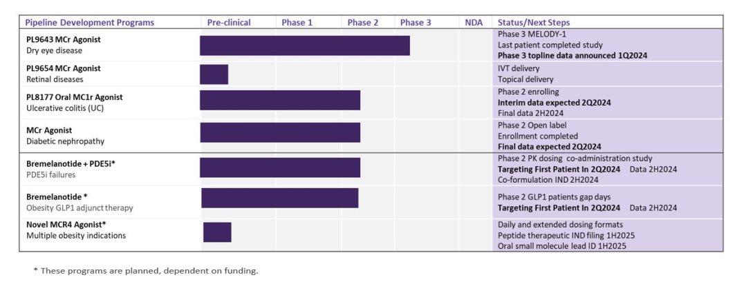 | o | PL9643, an ophthalmic peptide solution for dry eye disease (“DED”), which entered Phase 3 clinical trials in the fourth quarter of calendar year 2021, with top line results from the first Phase 3 clinical trial announced February 28, 2024, in which PL9643 did not achieve statistical significance for any clinical sign efficacy endpoint, and met positive results for the clinical symptom endpoint of pain, but only with age and sex adjustment in the statistical analysis; |