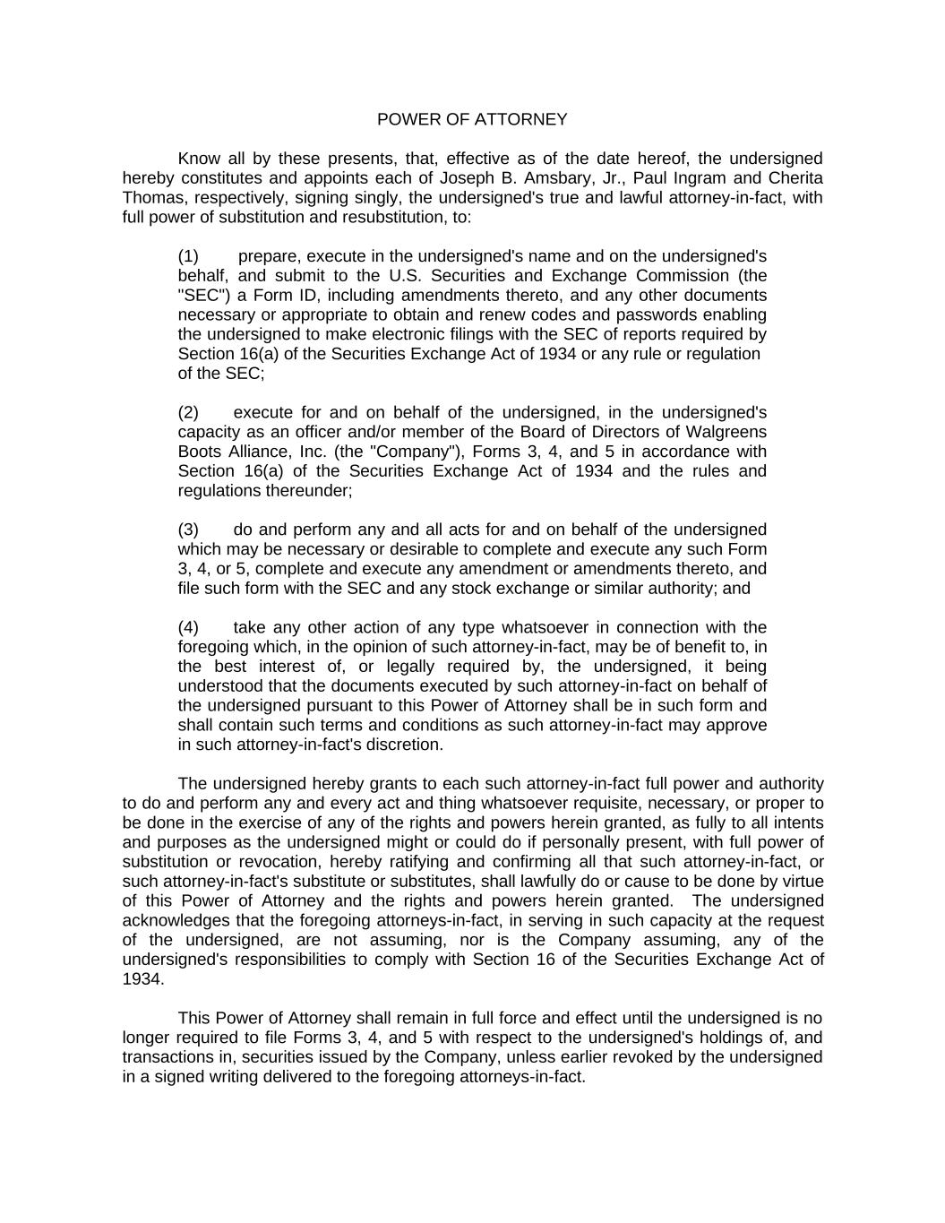 POWER OF ATTORNEY Know all by these presents, that, effective as of the date hereof, the undersigned hereby constitutes and appoints each of Joseph B. Amsbary, Jr., Paul Ingram and Cherita Thomas, respectively, signing singly, the undersigned's true and lawful attorney-in-fact, with full power of substitution and resubstitution, to: (1) prepare, execute in the undersigned's name and on the undersigned's behalf, and submit to the U.S. Securities and Exchange Commission (the "SEC") a Form ID, including amendments thereto, and any other documents necessary or appropriate to obtain and renew codes and passwords enabling the undersigned to make electronic filings with the SEC of reports required by Section 16(a) of the Securities Exchange Act of 1934 or any rule or regulation of the SEC; (2) execute for and on behalf of the undersigned, in the undersigned's capacity as an officer and/or member of the Board of Directors of Walgreens Boots Alliance, Inc. (the "Company"), Forms 3, 4, and 5 in accordance with Section 16(a) of the Securities Exchange Act of 1934 and the rules and regulations thereunder; (3) do and perform any and all acts for and on behalf of the undersigned which may be necessary or desirable to complete and execute any such Form 3, 4, or 5, complete and execute any amendment or amendments thereto, and file such form with the SEC and any stock exchange or similar authority; and (4) take any other action of any type whatsoever in connection with the foregoing which, in the opinion of such attorney-in-fact, may be of benefit to, in the best interest of, or legally required by, the undersigned, it being understood that the documents executed by such attorney-in-fact on behalf of the undersigned pursuant to this Power of Attorney shall be in such form and shall contain such terms and conditions as such attorney-in-fact may approve in such attorney-in-fact's discretion. The undersigned hereby grants to each such attorney-in-fact full power and authority to do and perform any and every act and thing whatsoever requisite, necessary, or proper to be done in the exercise of any of the rights and powers herein granted, as fully to all intents and purposes as the undersigned might or could do if personally present, with full power of substitution or revocation, hereby ratifying and confirming all that such attorney-in-fact, or such attorney-in-fact's substitute or substitutes, shall lawfully do or cause to be done by virtue of this Power of Attorney and the rights and powers herein granted. The undersigned acknowledges that the foregoing attorneys-in-fact, in serving in such capacity at the request of the undersigned, are not assuming, nor is the Company assuming, any of the undersigned's responsibilities to comply with Section 16 of the Securities Exchange Act of 1934. This Power of Attorney shall remain in full force and effect until the undersigned is no longer required to file Forms 3, 4, and 5 with respect to the undersigned's holdings of, and transactions in, securities issued by the Company, unless earlier revoked by the undersigned in a signed writing delivered to the foregoing attorneys-in-fact.