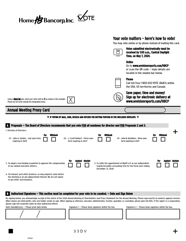 Small steps make an impact. Help the environment by consenting to receive electronic delivery, sign up at www.envisionreports.com/HBCP q IF VOTING BY MAIL, SIGN, DETACH AND RETURN THE BOTTOM PORTION IN THE ENCLOSED ENVELOPE. q Proxy — Home Bancorp, Inc. — 2024 Annual Meeting of Shareholders + The Petroleum Club of Lafayette 111 Heymann Boulevard, Lafayette, LA Proxy Solicited by the Board of Directors for Annual Meeting – May 7, 2024 The Board of Directors, or any of them, each with the power of substitution, are hereby authorized to represent and vote the shares of the undersigned, with all powers which the undersigned would possess if personally present, at the Annual Meeting of Shareholders of Home Bancorp, Inc. to be held on Tuesday, May 7, 2024 or at any postponement or adjournment thereof. Shares represented by this proxy will be voted as specified by the stockholder. If you sign and return this card without specifying how it is to be voted, the Proxies will have authority to vote FOR all nominees for director and FOR Proposals 2 and 3. This Proxy may be revoked at any time before it is exercised. In their discretion, the Proxies are authorized to vote upon such other business as may properly come before the meeting. (Items to be voted appear on reverse side.) C Non-Voting Items Change of Address — Please print new address below. Comments — Please print your comments below. Meeting Attendance Mark box to the right if you plan to attend the Annual Meeting. +
