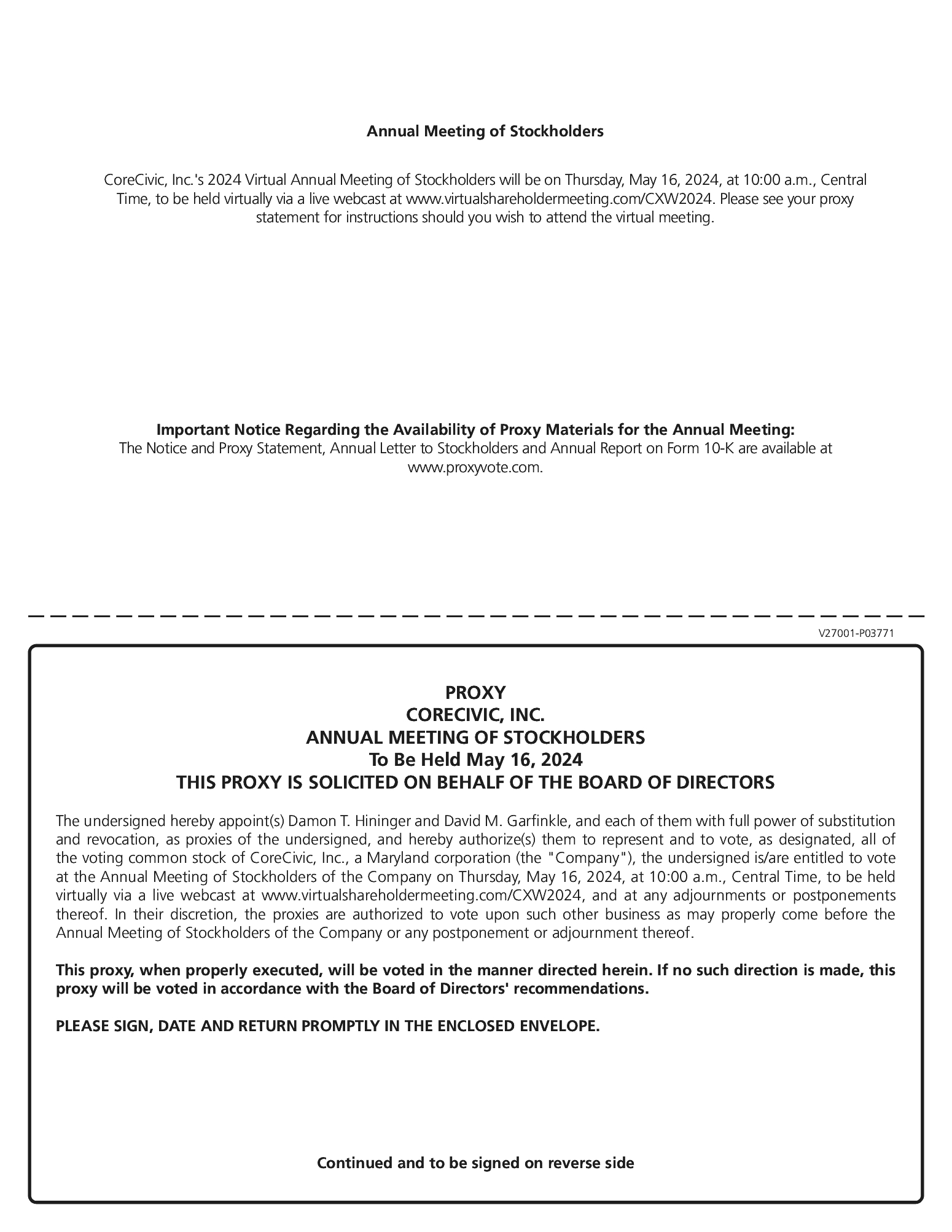 The SEC has adopted rules that permit companies and intermediaries such as brokers to satisfy delivery requirements for proxy statements and annual reports with respect to two or more stockholders sharing the same address by delivering a single copy of the Notice and, to the extent requested, a single set of proxy materials addressed to those stockholders. This process, which is commonly referred to as “householding,” potentially provides extra convenience for stockholders and cost savings for companies. The Company and some brokers household proxy materials unless contrary instructions have been received from the affected stockholders. Once you have received notice from your broker or us that they or we will be householding materials to your address, householding will continue until you are notified otherwise or until you provide instructions to the contrary. If at any time you do not wish to participate in householding and would prefer to receive a separate copy of the Notice or, to the extent requested, set of proxy materials, or if you are receiving multiple copies of proxy materials and wish to receive only one, please notify your broker if your shares are held in a brokerage account or our transfer agent, identified below, if you hold registered shares. You may also notify us by sending a written request to CoreCivic, Attention: Michael Grant, 5501 Virginia Way, Suite 110, Brentwood, Tennessee 37027.