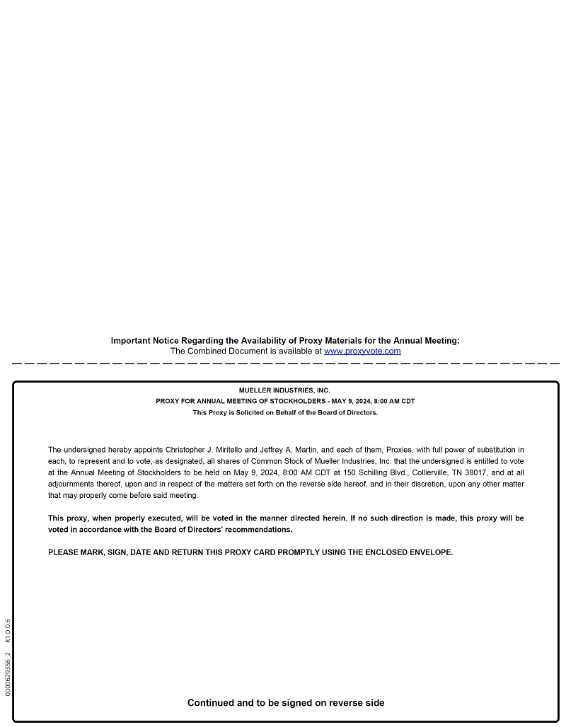 We are providing you with these proxy materials in connection with the solicitation by the Board of Directors of Mueller Industries, Inc. (the “Company”) of proxies for our 2024 Annual Meeting of Stockholders (the “Annual Meeting”), which will be held at 8:00 A.M. Central time on Thursday, May 9, 2024, at our corporate headquarters located at 150 Schilling Boulevard, Collierville, Tennessee 38017.