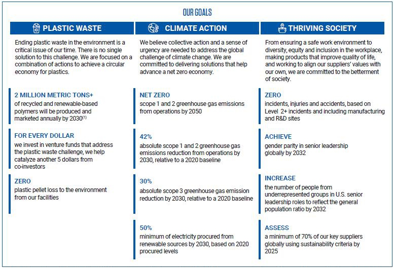 Throughout the year, our CLCS business built strong foundations to secure feedstock supply, expand our recycling footprint, and develop scalable recycling technologies to support the reduction of plastic waste in the environment. In addition, we formed joint ventures to build plastics recycling infrastructure in Europe, Asia, and North America. We also achieved nearly 90% of our goal to procure half of our electricity from renewable sources and issued our inaugural green bonds to help advance LYB’s long-term sustainability goals.