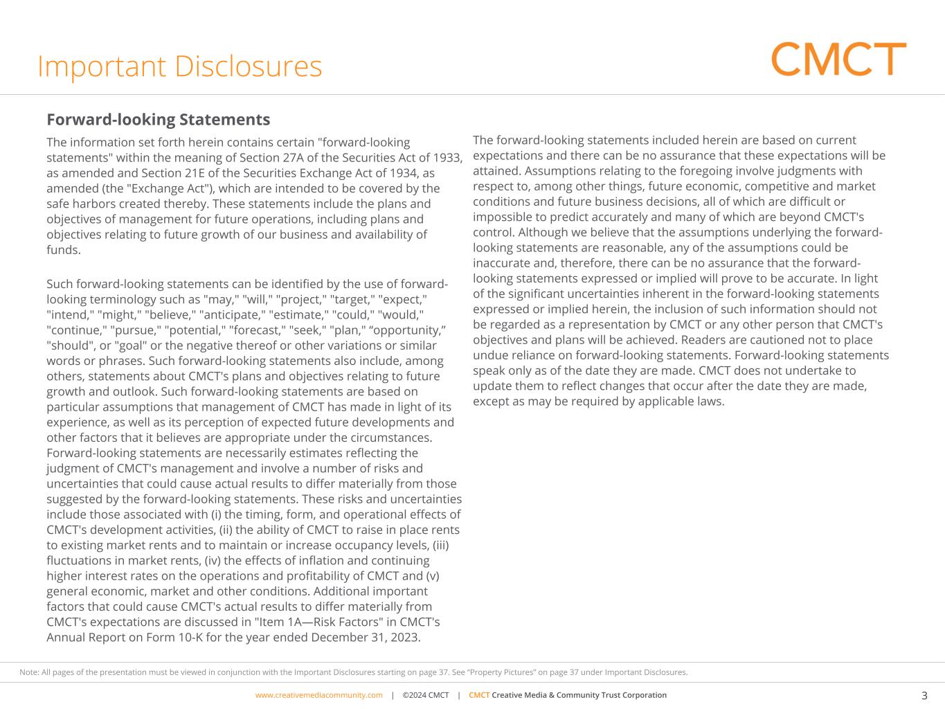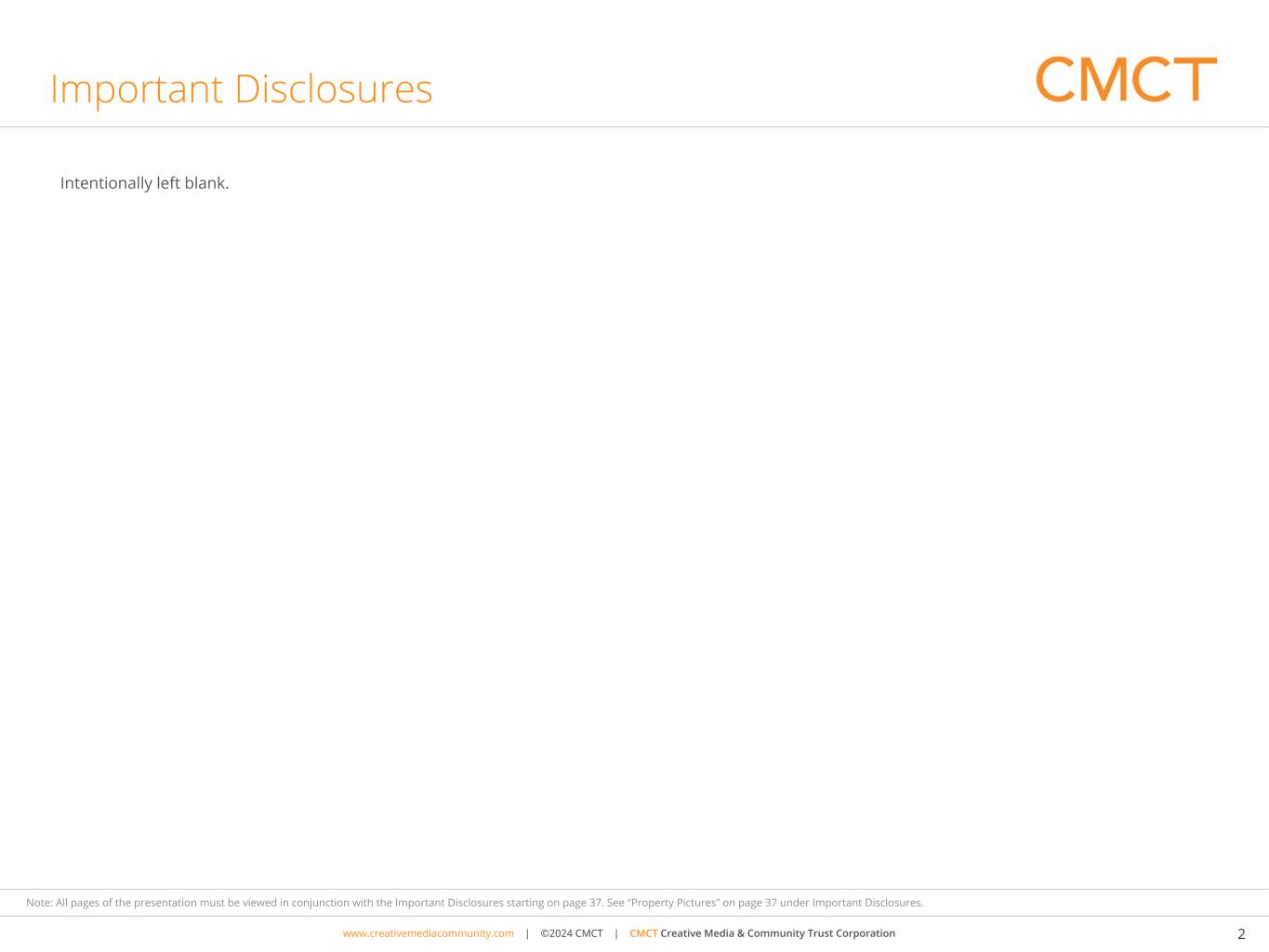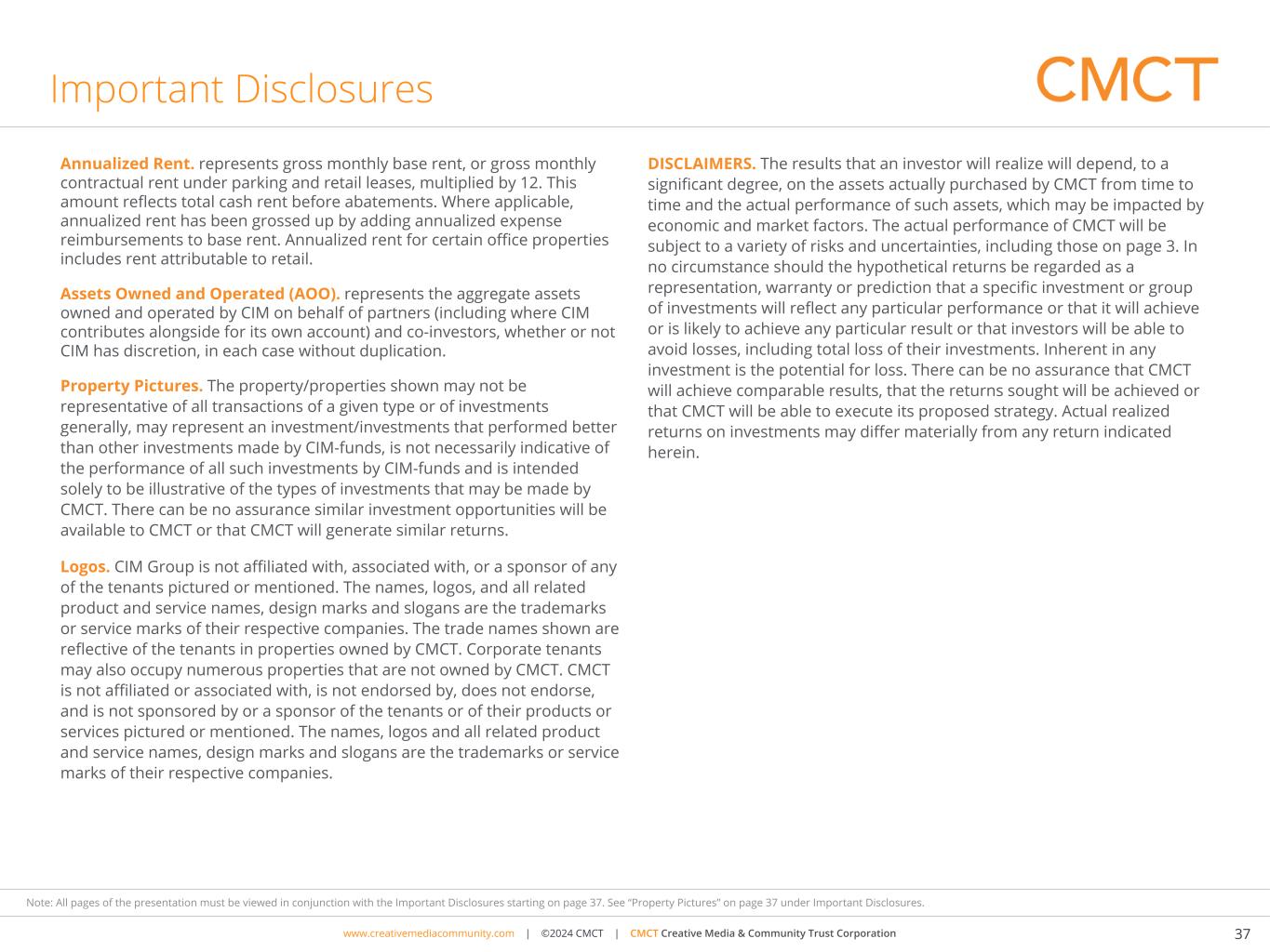 www.cimgroup.com | ©2018 CIM Group | TRADE SECRET / CONFIDENTIAL INFORMATIONwww.creativemediacommunity.com | ©2024 CMCT | CMCT Creative Media & Community Trust Corporation 37 Note: All pages of the presentation must be viewed in conjunction with the Important Disclosures starting on page 37. See “Property Pictures” on page 37 under Important Disclosures. Important Disclosures Annualized Rent. represents gross monthly base rent, or gross monthly contractual rent under parking and retail leases, multiplied by 12. This amount reflects total cash rent before abatements. Where applicable, annualized rent has been grossed up by adding annualized expense reimbursements to base rent. Annualized rent for certain office properties includes rent attributable to retail. Assets Owned and Operated (AOO). represents the aggregate assets owned and operated by CIM on behalf of partners (including where CIM contributes alongside for its own account) and co-investors, whether or not CIM has discretion, in each case without duplication. Property Pictures. The property/properties shown may not be representative of all transactions of a given type or of investments generally, may represent an investment/investments that performed better than other investments made by CIM-funds, is not necessarily indicative of the performance of all such investments by CIM-funds and is intended solely to be illustrative of the types of investments that may be made by CMCT. There can be no assurance similar investment opportunities will be available to CMCT or that CMCT will generate similar returns. Logos. CIM Group is not affiliated with, associated with, or a sponsor of any of the tenants pictured or mentioned. The names, logos, and all related product and service names, design marks and slogans are the trademarks or service marks of their respective companies. The trade names shown are reflective of the tenants in properties owned by CMCT. Corporate tenants may also occupy numerous properties that are not owned by CMCT. CMCT is not affiliated or associated with, is not endorsed by, does not endorse, and is not sponsored by or a sponsor of the tenants or of their products or services pictured or mentioned. The names, logos and all related product and service names, design marks and slogans are the trademarks or service marks of their respective companies. DISCLAIMERS. The results that an investor will realize will depend, to a significant degree, on the assets actually purchased by CMCT from time to time and the actual performance of such assets, which may be impacted by economic and market factors. The actual performance of CMCT will be subject to a variety of risks and uncertainties, including those on page 3. In no circumstance should the hypothetical returns be regarded as a representation, warranty or prediction that a specific investment or group of investments will reflect any particular performance or that it will achieve or is likely to achieve any particular result or that investors will be able to avoid losses, including total loss of their investments. Inherent in any investment is the potential for loss. There can be no assurance that CMCT will achieve comparable results, that the returns sought will be achieved or that CMCT will be able to execute its proposed strategy. Actual realized returns on investments may differ materially from any return indicated herein.