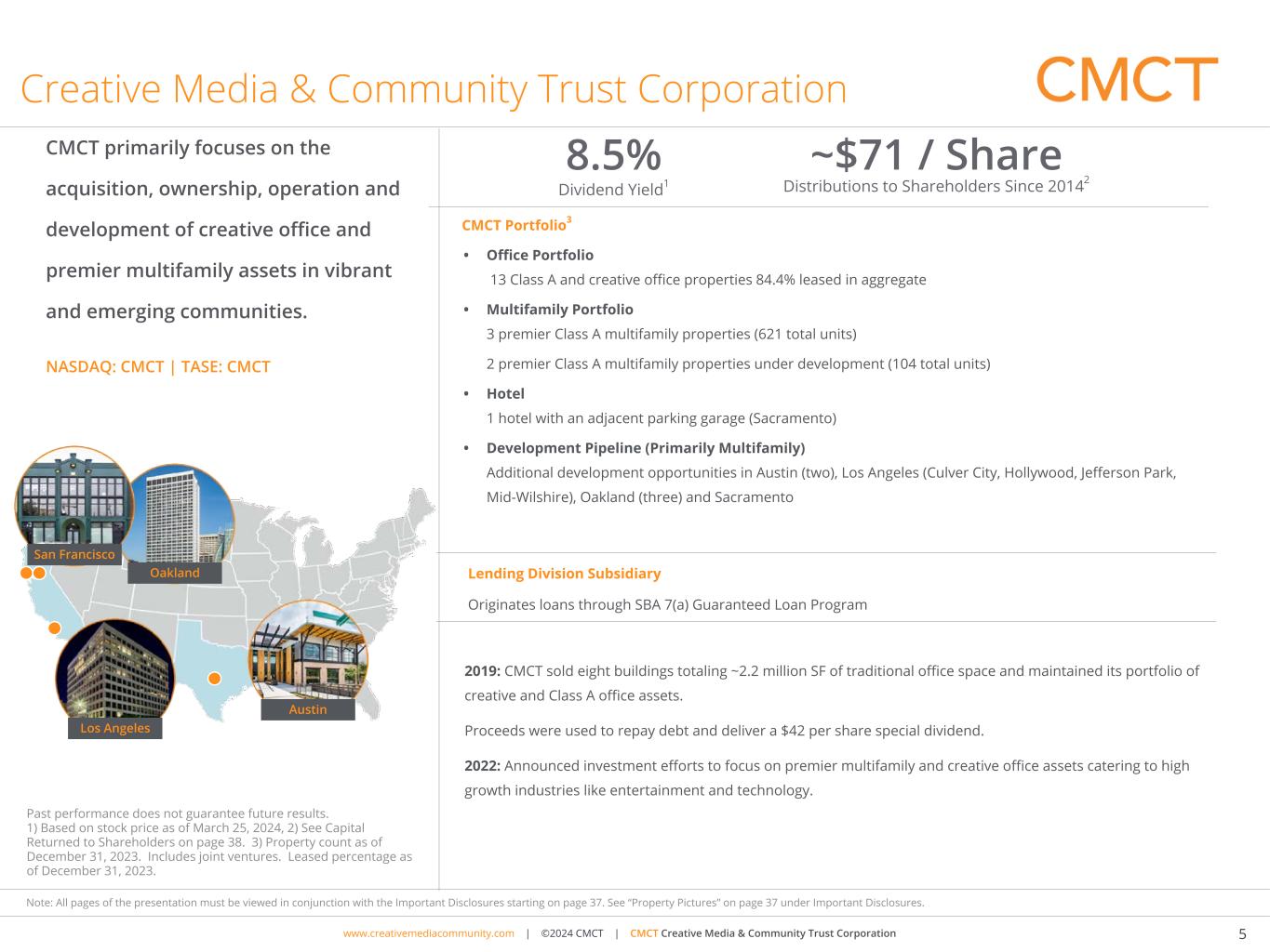 www.cimgroup.com | ©2018 CIM Group | TRADE SECRET / CONFIDENTIAL INFORMATIONwww.creativemediacommunity.com | ©2024 CMCT | CMCT Creative Media & Community Trust Corporation 4 Note: All pages of the presentation must be viewed in conjunction with the Important Disclosures starting on page 37. See “Property Pictures” on page 37 under Important Disclosures. CIM Group: Manager of CMCT CIM data as of September 30, 2023 (Assets Owned and Operated is unaudited). See disclosure statement under “Assets Owned and Operated” and “Property Pictures” on page 37. 1) Includes affiliates of CIM and officers and directors of CMCT. As of March 21, 2023. CIM Group Management, LLC (“CIM”) is a community-focused real estate and infrastructure owner, operator, lender and developer. The Independent | Austin 491,000 SF | For Sale Residential, Ground Floor Retail, Parking Key CIM Group Projects Santa Monica Westgate | Los Angeles 143,000 SF Residential, Ground Floor Retail Sunset La Cienega | Los Angeles 384,500 SF | Hotel, For Sale Residential, Ground Floor Retail Seaholm | Austin 551,000 SF | For Sale Residential, Ground Floor Retail, Parking 432 Park Avenue | New York City 518,250 SF | For Sale Residential, Ground Floor Retail 11 Madison | New York City 2.2M SF | Class A Office, Ground Floor Retail, Storage 1994 Established 403 Real Assets Owned and Operated $30.7B Assets Owned and Operated 1,000+ Employees 9 Corporate Offices Worldwide CIM Group owns ~45.7% of CMCT 1 Competitive Advantages Diverse Team of in-house Professionals Commitment to Community Disciplined Approach