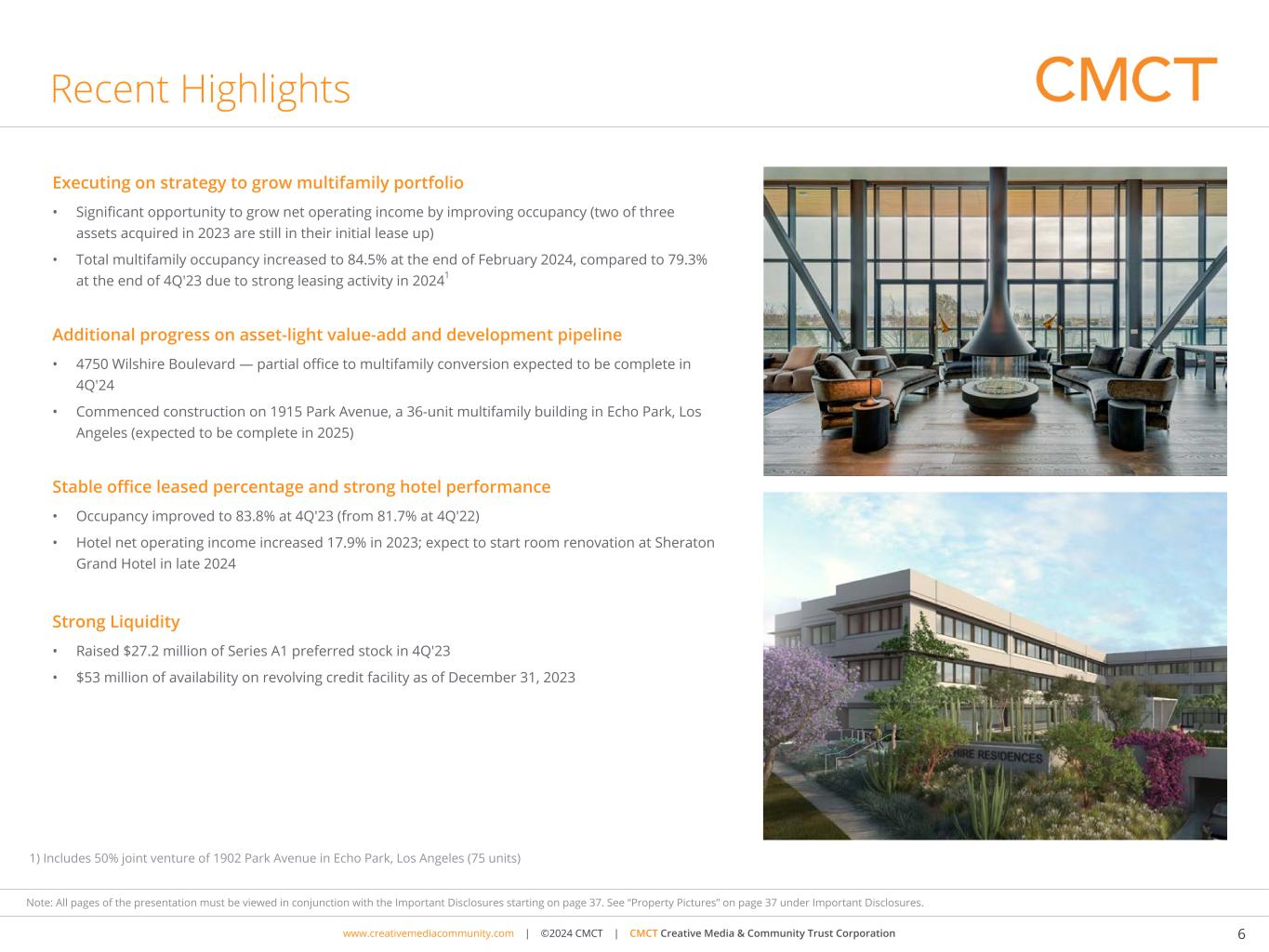 “We made additional strides in early 2024 improving our multifamily occupancy,” said David Thompson, Chief Executive Officer of Creative Media & Community Trust Corporation. “We believe there is a significant opportunity to improve our multifamily net operating income after we acquired two premier Class A multifamily residences in 2023 that are still in their lease-up phase following completion of construction.”