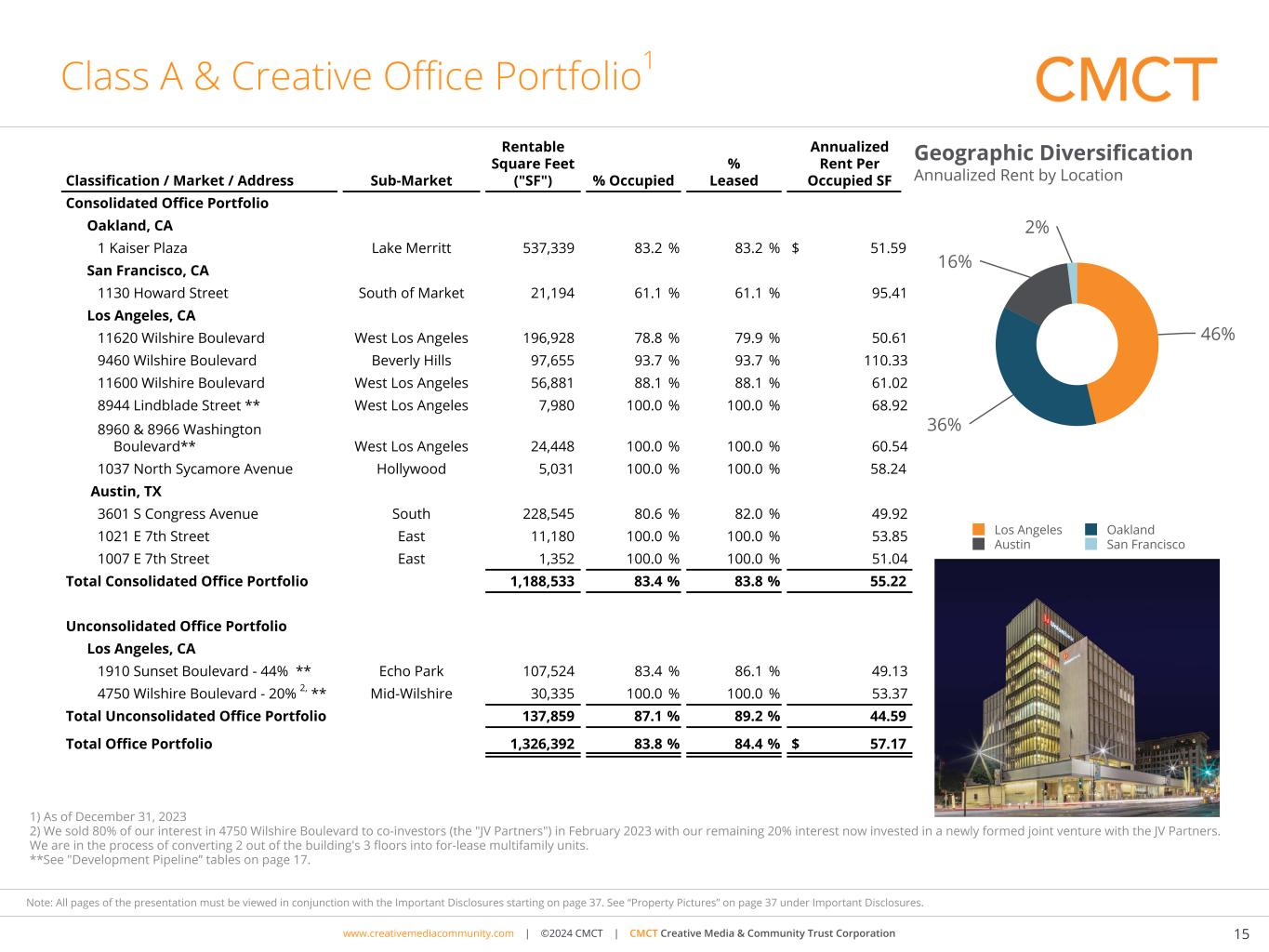 www.cimgroup.com | ©2018 CIM Group | TRADE SECRET / CONFIDENTIAL INFORMATIONwww.creativemediacommunity.com | ©2024 CMCT | CMCT Creative Media & Community Trust Corporation 15 Note: All pages of the presentation must be viewed in conjunction with the Important Disclosures starting on page 37. See “Property Pictures” on page 37 under Important Disclosures. Class A & Creative Office Portfolio1 Classification / Market / Address Sub-Market Rentable Square Feet ("SF") % Occupied % Leased Annualized Rent Per Occupied SF Consolidated Office Portfolio Oakland, CA 1 Kaiser Plaza Lake Merritt 537,339 83.2 % 83.2 % $ 51.59 San Francisco, CA 1130 Howard Street South of Market 21,194 61.1 % 61.1 % 95.41 Los Angeles, CA 11620 Wilshire Boulevard West Los Angeles 196,928 78.8 % 79.9 % 50.61 9460 Wilshire Boulevard Beverly Hills 97,655 93.7 % 93.7 % 110.33 11600 Wilshire Boulevard West Los Angeles 56,881 88.1 % 88.1 % 61.02 8944 Lindblade Street ** West Los Angeles 7,980 100.0 % 100.0 % 68.92 8960 & 8966 Washington Boulevard** West Los Angeles 24,448 100.0 % 100.0 % 60.54 1037 North Sycamore Avenue Hollywood 5,031 100.0 % 100.0 % 58.24 Austin, TX 3601 S Congress Avenue South 228,545 80.6 % 82.0 % 49.92 1021 E 7th Street East 11,180 100.0 % 100.0 % 53.85 1007 E 7th Street East 1,352 100.0 % 100.0 % 51.04 Total Consolidated Office Portfolio 1,188,533 83.4 % 83.8 % 55.22 Unconsolidated Office Portfolio Los Angeles, CA 1910 Sunset Boulevard - 44% ** Echo Park 107,524 83.4 % 86.1 % 49.13 4750 Wilshire Boulevard - 20% 2, ** Mid-Wilshire 30,335 100.0 % 100.0 % 53.37 Total Unconsolidated Office Portfolio 137,859 87.1 % 89.2 % 44.59 Total Office Portfolio 1,326,392 83.8 % 84.4 % $ 57.17 46% 36% 16% 2% Los Angeles Oakland Austin San Francisco 1) As of December 31, 2023 2) We sold 80% of our interest in 4750 Wilshire Boulevard to co-investors (the "JV Partners") in February 2023 with our remaining 20% interest now invested in a newly formed joint venture with the JV Partners. We are in the process of converting 2 out of the building's 3 floors into for-lease multifamily units. **See "Development Pipeline” tables on page 17. Geographic Diversification Annualized Rent by Location