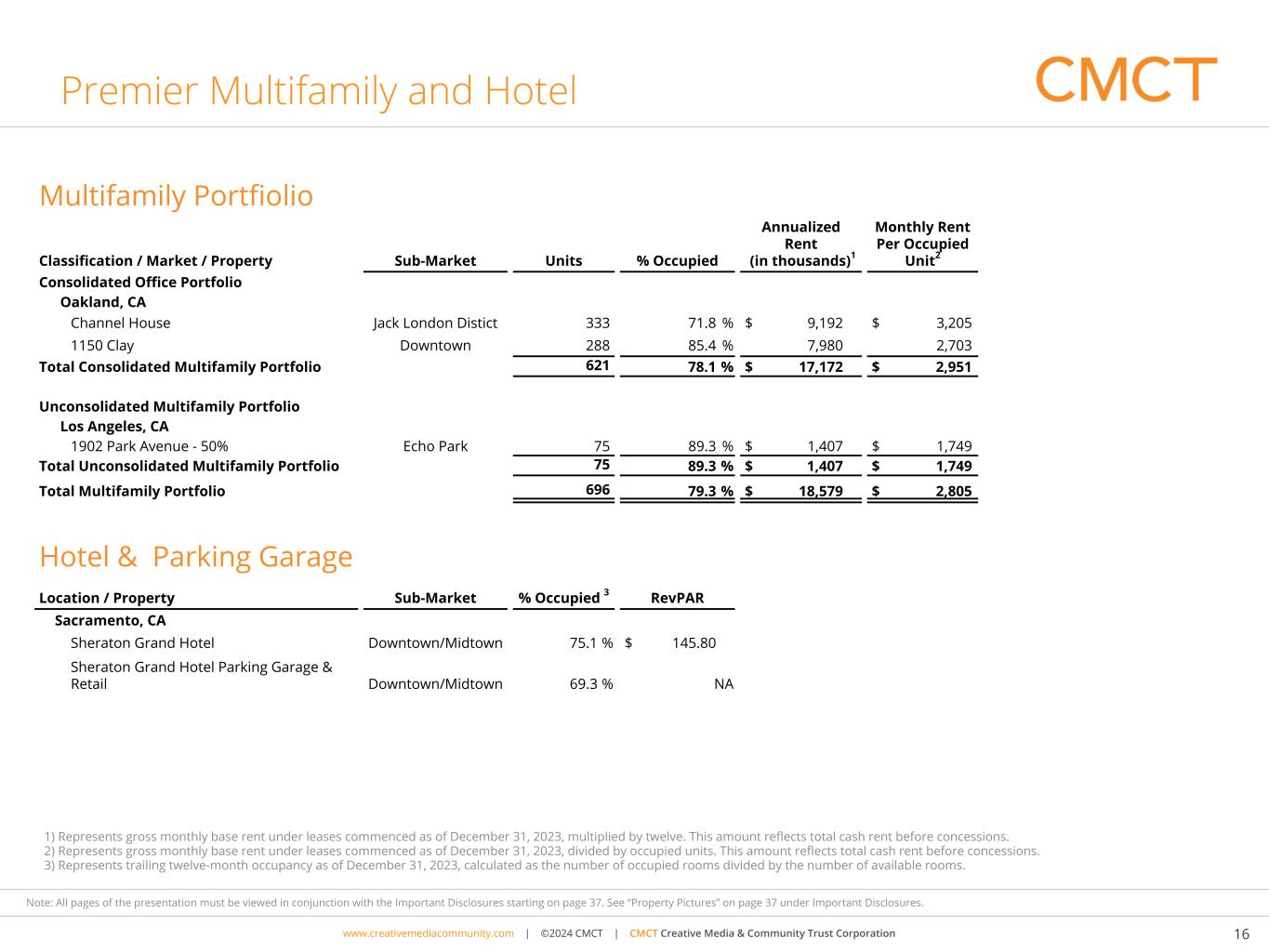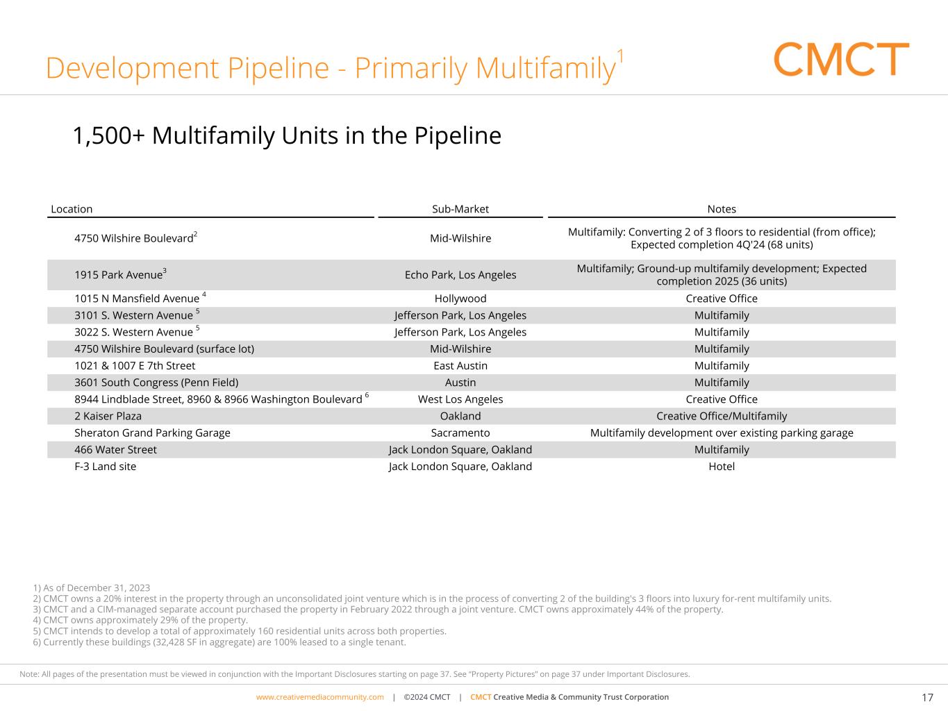 www.cimgroup.com | ©2018 CIM Group | TRADE SECRET / CONFIDENTIAL INFORMATIONwww.creativemediacommunity.com | ©2024 CMCT | CMCT Creative Media & Community Trust Corporation 16 Note: All pages of the presentation must be viewed in conjunction with the Important Disclosures starting on page 37. See “Property Pictures” on page 37 under Important Disclosures. 1) Represents gross monthly base rent under leases commenced as of December 31, 2023, multiplied by twelve. This amount reflects total cash rent before concessions. 2) Represents gross monthly base rent under leases commenced as of December 31, 2023, divided by occupied units. This amount reflects total cash rent before concessions. 3) Represents trailing twelve-month occupancy as of December 31, 2023, calculated as the number of occupied rooms divided by the number of available rooms. Premier Multifamily and Hotel Multifamily Portfiolio Classification / Market / Property Sub-Market Units % Occupied Annualized Rent (in thousands)1 Monthly Rent Per Occupied Unit2 Consolidated Office Portfolio Oakland, CA Channel House Jack London Distict 333 71.8 % $ 9,192 $ 3,205 1150 Clay Downtown 288 85.4 % 7,980 2,703 Total Consolidated Multifamily Portfolio 621 78.1 % $ 17,172 $ 2,951 Unconsolidated Multifamily Portfolio Los Angeles, CA 1902 Park Avenue - 50% Echo Park 75 89.3 % $ 1,407 $ 1,749 Total Unconsolidated Multifamily Portfolio 75 89.3 % $ 1,407 $ 1,749 Total Multifamily Portfolio 696 79.3 % $ 18,579 $ 2,805 Hotel & Parking Garage Location / Property Sub-Market % Occupied 3 RevPAR Sacramento, CA Sheraton Grand Hotel Downtown/Midtown 75.1 % $ 145.80 Sheraton Grand Hotel Parking Garage & Retail Downtown/Midtown 69.3 % NA