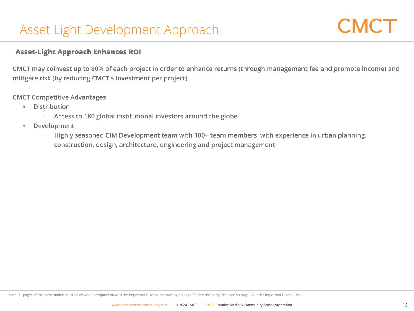 www.cimgroup.com | ©2018 CIM Group | TRADE SECRET / CONFIDENTIAL INFORMATIONwww.creativemediacommunity.com | ©2024 CMCT | CMCT Creative Media & Community Trust Corporation 18 Note: All pages of the presentation must be viewed in conjunction with the Important Disclosures starting on page 37. See “Property Pictures” on page 37 under Important Disclosures. Asset Light Development Approach CMCT may coinvest up to 80% of each project in order to enhance returns (through management fee and promote income) and mitigate risk (by reducing CMCT's investment per project) CMCT Competitive Advantages • Distribution ◦ Access to 180 global institutional investors around the globe • Development ◦ Highly seasoned CIM Development team with 100+ team members with experience in urban planning, construction, design, architecture, engineering and project management Asset-Light Approach Enhances ROI