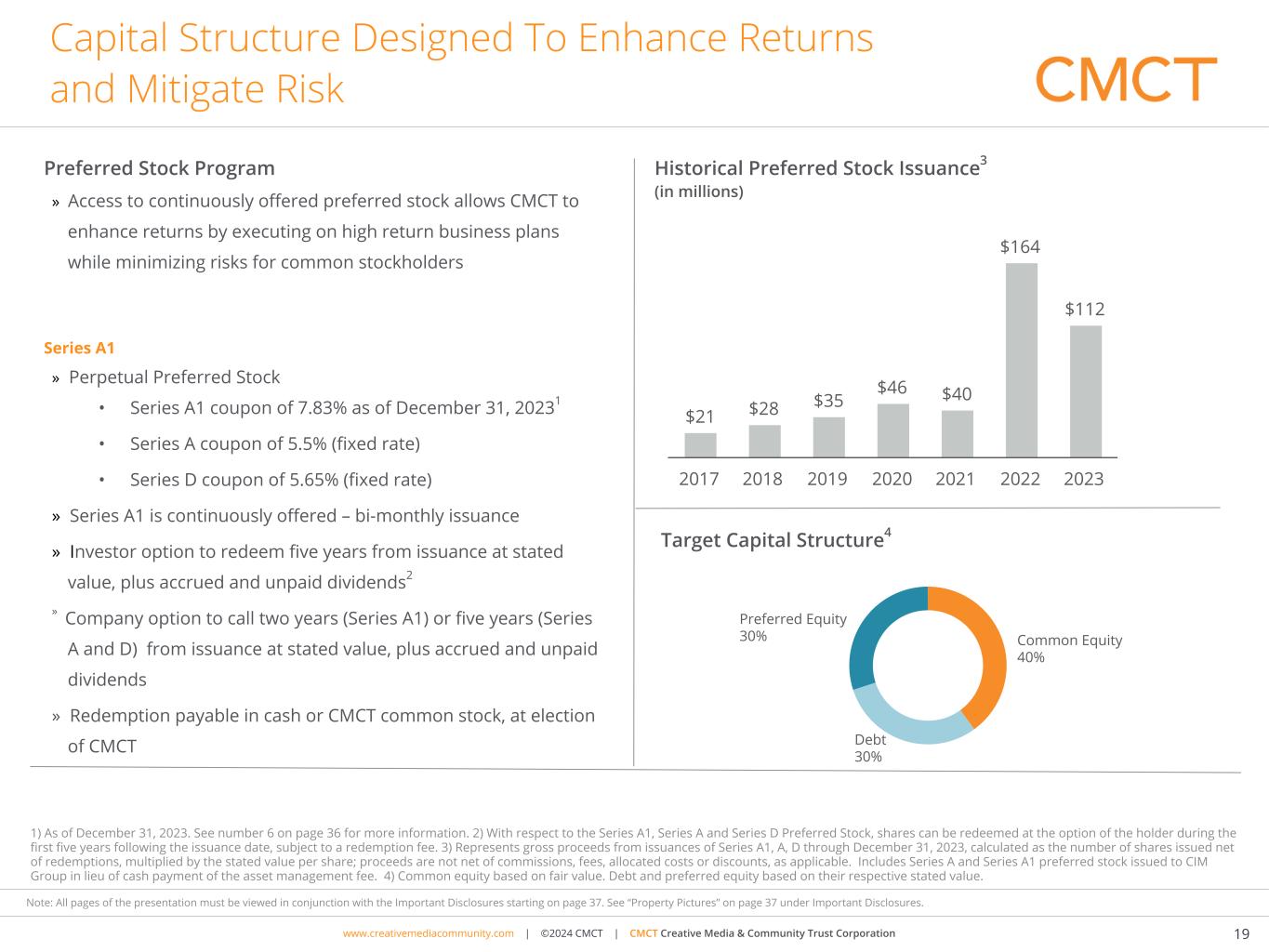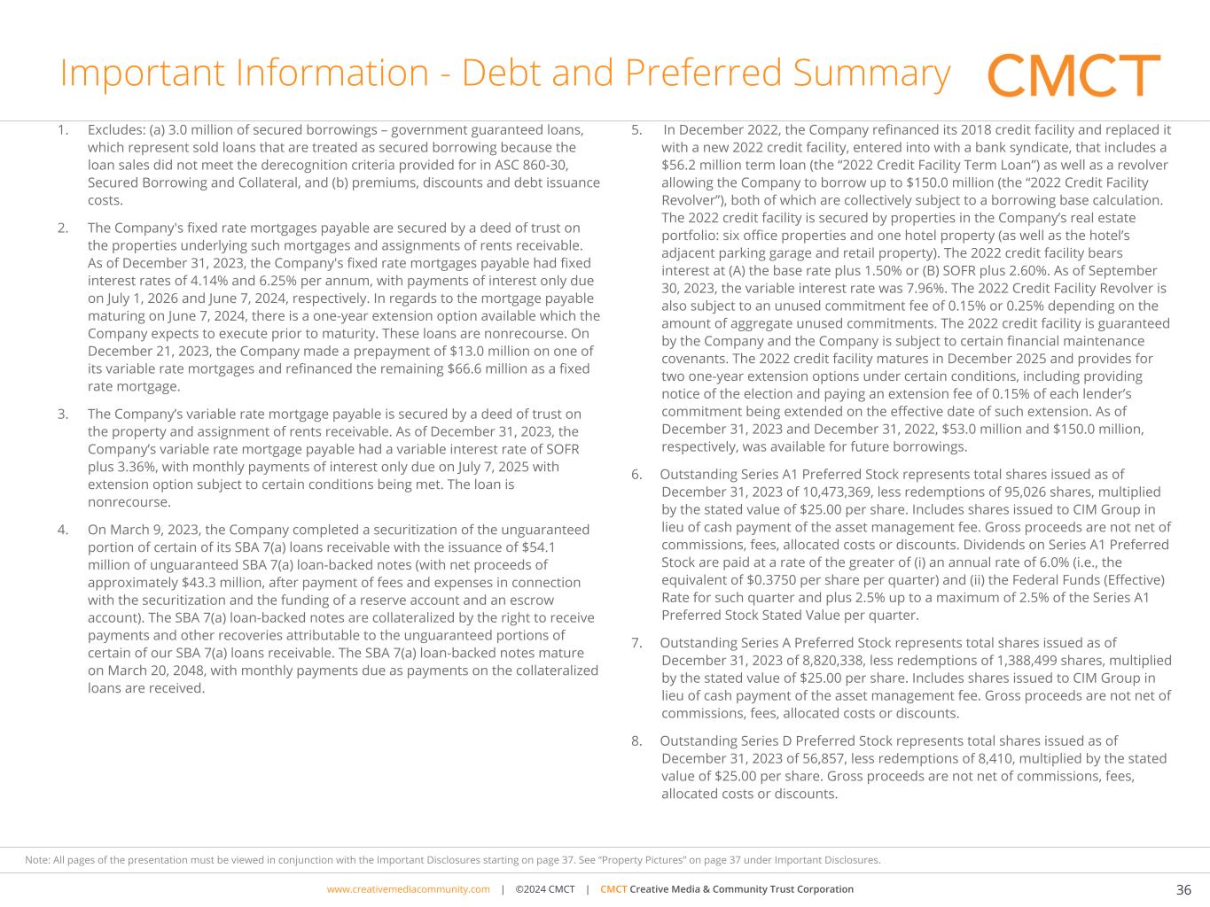 www.cimgroup.com | ©2018 CIM Group | TRADE SECRET / CONFIDENTIAL INFORMATIONwww.creativemediacommunity.com | ©2024 CMCT | CMCT Creative Media & Community Trust Corporation 36 Note: All pages of the presentation must be viewed in conjunction with the Important Disclosures starting on page 37. See “Property Pictures” on page 37 under Important Disclosures. Important Information - Debt and Preferred Summary 1. Excludes: (a) 3.0 million of secured borrowings – government guaranteed loans, which represent sold loans that are treated as secured borrowing because the loan sales did not meet the derecognition criteria provided for in ASC 860-30, Secured Borrowing and Collateral, and (b) premiums, discounts and debt issuance costs. 2. The Company's fixed rate mortgages payable are secured by a deed of trust on the properties underlying such mortgages and assignments of rents receivable. As of December 31, 2023, the Company's fixed rate mortgages payable had fixed interest rates of 4.14% and 6.25% per annum, with payments of interest only due on July 1, 2026 and June 7, 2024, respectively. In regards to the mortgage payable maturing on June 7, 2024, there is a one-year extension option available which the Company expects to execute prior to maturity. These loans are nonrecourse. On December 21, 2023, the Company made a prepayment of $13.0 million on one of its variable rate mortgages and refinanced the remaining $66.6 million as a fixed rate mortgage. 3. The Company’s variable rate mortgage payable is secured by a deed of trust on the property and assignment of rents receivable. As of December 31, 2023, the Company’s variable rate mortgage payable had a variable interest rate of SOFR plus 3.36%, with monthly payments of interest only due on July 7, 2025 with extension option subject to certain conditions being met. The loan is nonrecourse. 4. On March 9, 2023, the Company completed a securitization of the unguaranteed portion of certain of its SBA 7(a) loans receivable with the issuance of $54.1 million of unguaranteed SBA 7(a) loan-backed notes (with net proceeds of approximately $43.3 million, after payment of fees and expenses in connection with the securitization and the funding of a reserve account and an escrow account). The SBA 7(a) loan-backed notes are collateralized by the right to receive payments and other recoveries attributable to the unguaranteed portions of certain of our SBA 7(a) loans receivable. The SBA 7(a) loan-backed notes mature on March 20, 2048, with monthly payments due as payments on the collateralized loans are received. 5. In December 2022, the Company refinanced its 2018 credit facility and replaced it with a new 2022 credit facility, entered into with a bank syndicate, that includes a $56.2 million term loan (the “2022 Credit Facility Term Loan”) as well as a revolver allowing the Company to borrow up to $150.0 million (the “2022 Credit Facility Revolver”), both of which are collectively subject to a borrowing base calculation. The 2022 credit facility is secured by properties in the Company’s real estate portfolio: six office properties and one hotel property (as well as the hotel’s adjacent parking garage and retail property). The 2022 credit facility bears interest at (A) the base rate plus 1.50% or (B) SOFR plus 2.60%. As of September 30, 2023, the variable interest rate was 7.96%. The 2022 Credit Facility Revolver is also subject to an unused commitment fee of 0.15% or 0.25% depending on the amount of aggregate unused commitments. The 2022 credit facility is guaranteed by the Company and the Company is subject to certain financial maintenance covenants. The 2022 credit facility matures in December 2025 and provides for two one-year extension options under certain conditions, including providing notice of the election and paying an extension fee of 0.15% of each lender’s commitment being extended on the effective date of such extension. As of December 31, 2023 and December 31, 2022, $53.0 million and $150.0 million, respectively, was available for future borrowings. 6. Outstanding Series A1 Preferred Stock represents total shares issued as of December 31, 2023 of 10,473,369, less redemptions of 95,026 shares, multiplied by the stated value of $25.00 per share. Includes shares issued to CIM Group in lieu of cash payment of the asset management fee. Gross proceeds are not net of commissions, fees, allocated costs or discounts. Dividends on Series A1 Preferred Stock are paid at a rate of the greater of (i) an annual rate of 6.0% (i.e., the equivalent of $0.3750 per share per quarter) and (ii) the Federal Funds (Effective) Rate for such quarter and plus 2.5% up to a maximum of 2.5% of the Series A1 Preferred Stock Stated Value per quarter. 7. Outstanding Series A Preferred Stock represents total shares issued as of December 31, 2023 of 8,820,338, less redemptions of 1,388,499 shares, multiplied by the stated value of $25.00 per share. Includes shares issued to CIM Group in lieu of cash payment of the asset management fee. Gross proceeds are not net of commissions, fees, allocated costs or discounts. 8. Outstanding Series D Preferred Stock represents total shares issued as of December 31, 2023 of 56,857, less redemptions of 8,410, multiplied by the stated value of $25.00 per share. Gross proceeds are not net of commissions, fees, allocated costs or discounts.