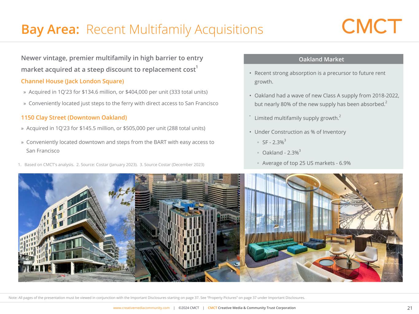 www.cimgroup.com | ©2018 CIM Group | TRADE SECRET / CONFIDENTIAL INFORMATIONwww.creativemediacommunity.com | ©2024 CMCT | CMCT Creative Media & Community Trust Corporation 21 Note: All pages of the presentation must be viewed in conjunction with the Important Disclosures starting on page 37. See “Property Pictures” on page 37 under Important Disclosures. Bay Area: Recent Multifamily Acquisitions Channel House (Jack London Square) » Acquired in 1Q'23 for $134.6 million, or $404,000 per unit (333 total units) » Conveniently located just steps to the ferry with direct access to San Francisco 1150 Clay Street (Downtown Oakland) » Acquired in 1Q'23 for $145.5 million, or $505,000 per unit (288 total units) » Conveniently located downtown and steps from the BART with easy access to San Francisco Oakland MarketNewer vintage, premier multifamily in high barrier to entry market acquired at a steep discount to replacement cost1 • Recent strong absorption is a precursor to future rent growth. • Oakland had a wave of new Class A supply from 2018-2022, but nearly 80% of the new supply has been absorbed.2 • Limited multifamily supply growth.2 • Under Construction as % of Inventory ◦ SF - 2.3%3 ◦ Oakland - 2.3%3 ◦ Average of top 25 US markets - 6.9%1. Based on CMCT's analysis. 2. Source: Costar (January 2023). 3. Source Costar (December 2023)