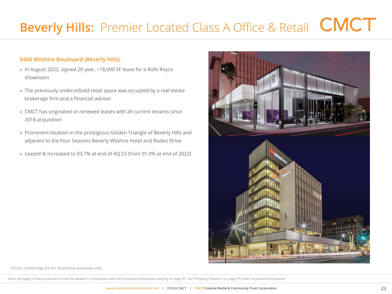 www.cimgroup.com | ©2018 CIM Group | TRADE SECRET / CONFIDENTIAL INFORMATIONwww.creativemediacommunity.com | ©2024 CMCT | CMCT Creative Media & Community Trust Corporation 23 Note: All pages of the presentation must be viewed in conjunction with the Important Disclosures starting on page 37. See “Property Pictures” on page 37 under Important Disclosures. Beverly Hills: Premier Located Class A Office & Retail 9460 Wilshire Boulevard (Beverly Hills) » In August 2022, signed 20 year, ~18,000 SF lease for a Rolls Royce showroom » The previously underutilized retail space was occupied by a real estate brokerage firm and a financial advisor » CMCT has originated or renewed leases with all current tenants since 2018 acquisition » Prominent location in the prestigious Golden Triangle of Beverly Hills and adjacent to the Four Seasons Beverly Wilshire Hotel and Rodeo Drive » Leased % increased to 93.7% at end of 4Q'23 (from 91.0% at end of 2022) Artistic renderings are for illustrative purposes only