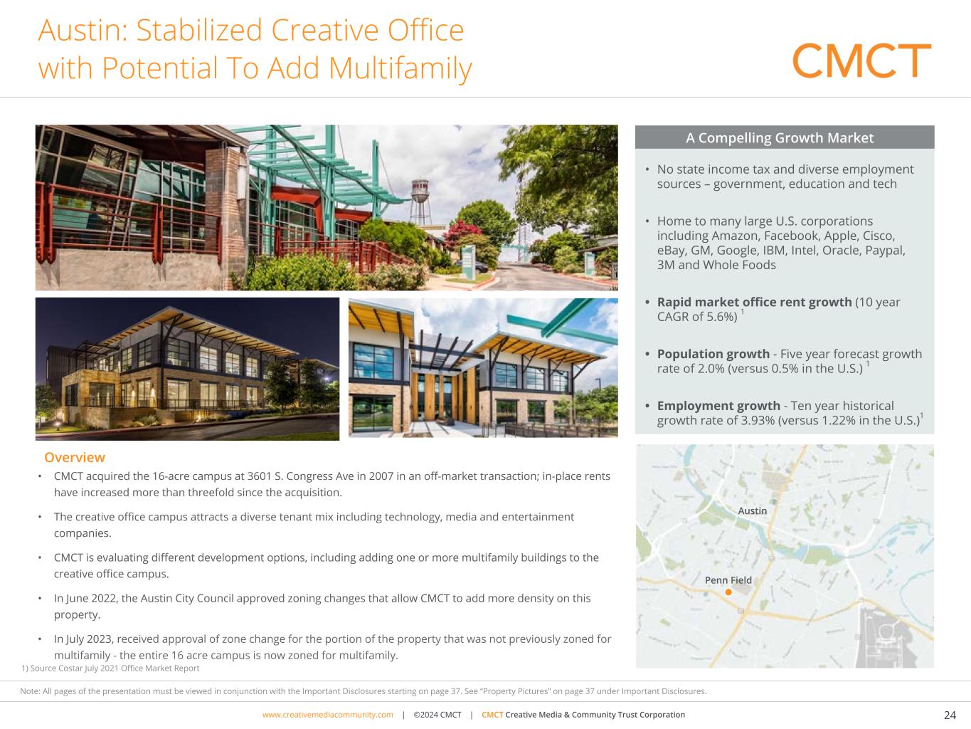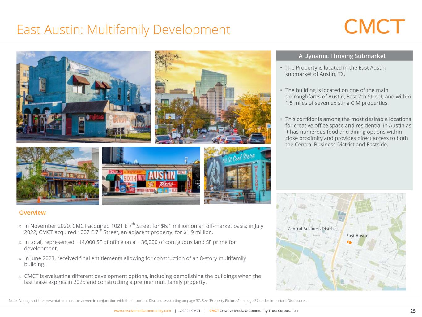 www.cimgroup.com | ©2018 CIM Group | TRADE SECRET / CONFIDENTIAL INFORMATIONwww.creativemediacommunity.com | ©2024 CMCT | CMCT Creative Media & Community Trust Corporation 24 Note: All pages of the presentation must be viewed in conjunction with the Important Disclosures starting on page 37. See “Property Pictures” on page 37 under Important Disclosures. Austin: Stabilized Creative Office with Potential To Add Multifamily • CMCT acquired the 16-acre campus at 3601 S. Congress Ave in 2007 in an off-market transaction; in-place rents have increased more than threefold since the acquisition. • The creative office campus attracts a diverse tenant mix including technology, media and entertainment companies. • CMCT is evaluating different development options, including adding one or more multifamily buildings to the creative office campus. • In June 2022, the Austin City Council approved zoning changes that allow CMCT to add more density on this property. • In July 2023, received approval of zone change for the portion of the property that was not previously zoned for multifamily - the entire 16 acre campus is now zoned for multifamily. • No state income tax and diverse employment sources – government, education and tech • Home to many large U.S. corporations including Amazon, Facebook, Apple, Cisco, eBay, GM, Google, IBM, Intel, Oracle, Paypal, 3M and Whole Foods • Rapid market office rent growth (10 year CAGR of 5.6%) 1 • Population growth - Five year forecast growth rate of 2.0% (versus 0.5% in the U.S.) 1 • Employment growth - Ten year historical growth rate of 3.93% (versus 1.22% in the U.S.)1 A Compelling Growth Market Austin Overview Penn Field Penn Field Austin 1) Source Costar July 2021 Office Market Report