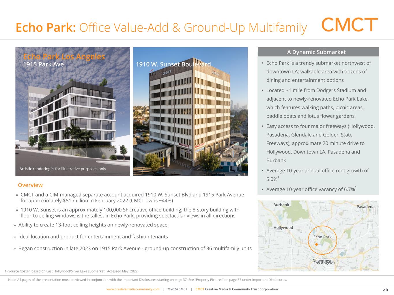 www.cimgroup.com | ©2018 CIM Group | TRADE SECRET / CONFIDENTIAL INFORMATIONwww.creativemediacommunity.com | ©2024 CMCT | CMCT Creative Media & Community Trust Corporation 25 Note: All pages of the presentation must be viewed in conjunction with the Important Disclosures starting on page 37. See “Property Pictures” on page 37 under Important Disclosures. East Austin: Multifamily Development • The Property is located in the East Austin submarket of Austin, TX. • The building is located on one of the main thoroughfares of Austin, East 7th Street, and within 1.5 miles of seven existing CIM properties. • This corridor is among the most desirable locations for creative office space and residential in Austin as it has numerous food and dining options within close proximity and provides direct access to both the Central Business District and Eastside. A Dynamic Thriving Submarket Overview Central Business District East Austin East Austin, Texas » In November 2020, CMCT acquired 1021 E 7th Street for $6.1 million on an off-market basis; in July 2022, CMCT acquired 1007 E 7Th Street, an adjacent property, for $1.9 million. » In total, represented ~14,000 SF of office on a ~36,000 of contiguous land SF prime for development. » In June 2023, received final entitlements allowing for construction of an 8-story multifamily building. » CMCT is evaluating different development options, including demolishing the buildings when the last lease expires in 2025 and constructing a premier multifamily property.