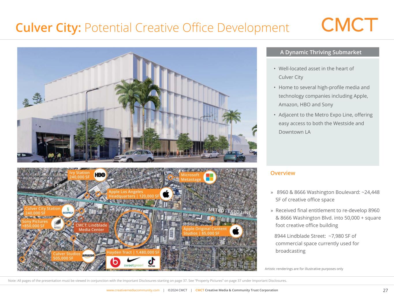 www.cimgroup.com | ©2018 CIM Group | TRADE SECRET / CONFIDENTIAL INFORMATIONwww.creativemediacommunity.com | ©2024 CMCT | CMCT Creative Media & Community Trust Corporation 27 Note: All pages of the presentation must be viewed in conjunction with the Important Disclosures starting on page 37. See “Property Pictures” on page 37 under Important Disclosures. Culver City: Potential Creative Office Development » 8960 & 8666 Washington Boulevard: ~24,448 SF of creative office space » Received final entitlement to re-develop 8960 & 8666 Washington Blvd. into 50,000 + square foot creative office building 8944 Lindblade Street: ~7,980 SF of commercial space currently used for broadcasting Culver City Los Angeles Overview • Well-located asset in the heart of Culver City • Home to several high-profile media and technology companies including Apple, Amazon, HBO and Sony • Adjacent to the Metro Expo Line, offering easy access to both the Westside and Downtown LA A Dynamic Thriving Submarket Artistic renderings are for illustrative purposes only Artistic renderings are for illustrative purposes only