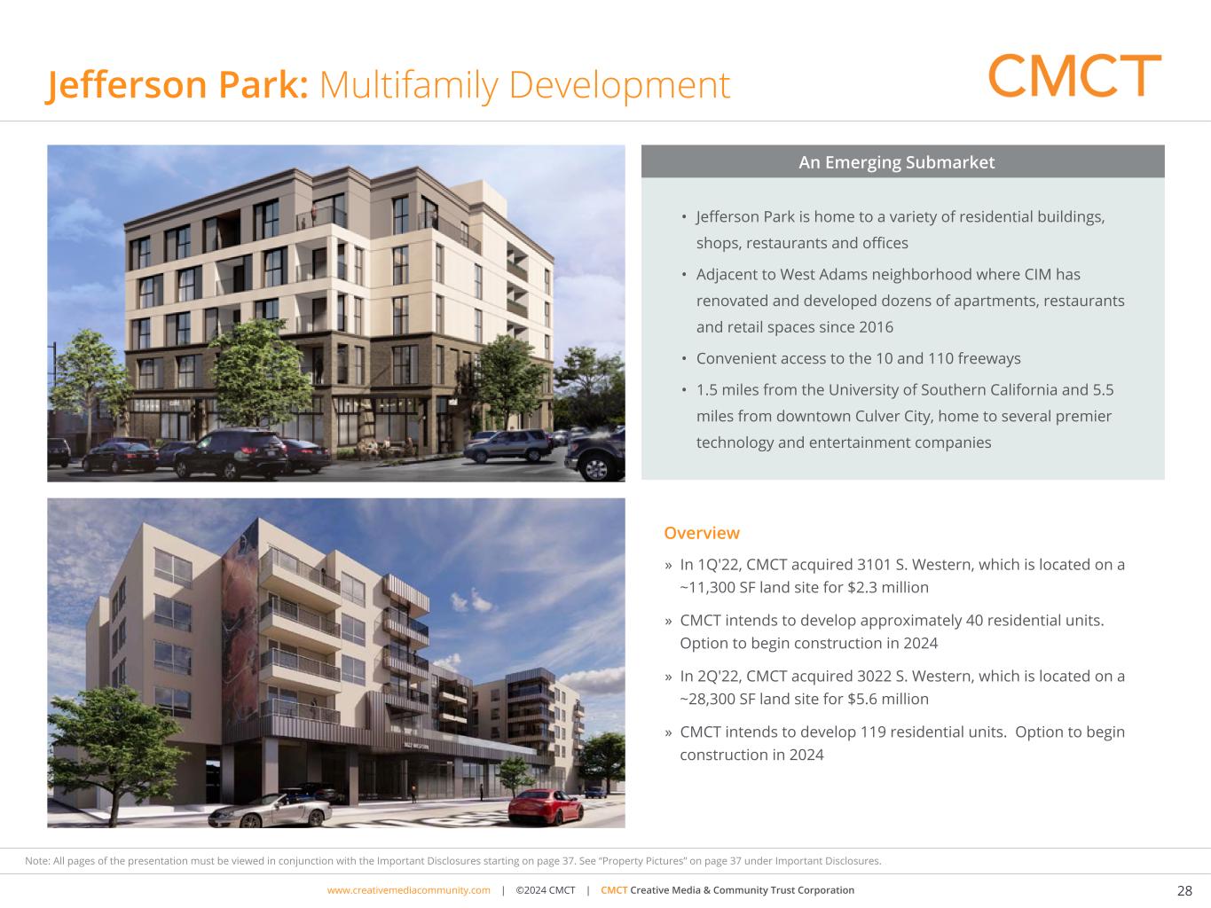 www.cimgroup.com | ©2018 CIM Group | TRADE SECRET / CONFIDENTIAL INFORMATIONwww.creativemediacommunity.com | ©2024 CMCT | CMCT Creative Media & Community Trust Corporation 28 Note: All pages of the presentation must be viewed in conjunction with the Important Disclosures starting on page 37. See “Property Pictures” on page 37 under Important Disclosures. Jefferson Park: Multifamily Development » In 1Q'22, CMCT acquired 3101 S. Western, which is located on a ~11,300 SF land site for $2.3 million » CMCT intends to develop approximately 40 residential units. Option to begin construction in 2024 » In 2Q'22, CMCT acquired 3022 S. Western, which is located on a ~28,300 SF land site for $5.6 million » CMCT intends to develop 119 residential units. Option to begin construction in 2024 Culver City Los Angeles Overview • Jefferson Park is home to a variety of residential buildings, shops, restaurants and offices • Adjacent to West Adams neighborhood where CIM has renovated and developed dozens of apartments, restaurants and retail spaces since 2016 • Convenient access to the 10 and 110 freeways • 1.5 miles from the University of Southern California and 5.5 miles from downtown Culver City, home to several premier technology and entertainment companies An Emerging Submarket Artistic renderings are for illustrative purposes only
