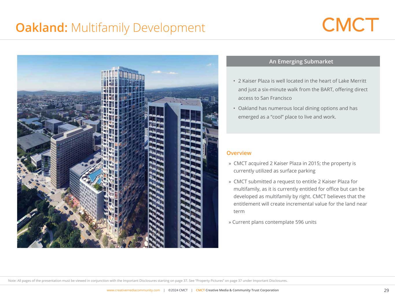 www.cimgroup.com | ©2018 CIM Group | TRADE SECRET / CONFIDENTIAL INFORMATIONwww.creativemediacommunity.com | ©2024 CMCT | CMCT Creative Media & Community Trust Corporation 29 Note: All pages of the presentation must be viewed in conjunction with the Important Disclosures starting on page 37. See “Property Pictures” on page 37 under Important Disclosures. Oakland: Multifamily Development » CMCT acquired 2 Kaiser Plaza in 2015; the property is currently utilized as surface parking » CMCT submitted a request to entitle 2 Kaiser Plaza for multifamily, as it is currently entitled for office but can be developed as multifamily by right. CMCT believes that the entitlement will create incremental value for the land near term » Current plans contemplate 596 units Culver City Los Angeles Overview • 2 Kaiser Plaza is well located in the heart of Lake Merritt and just a six-minute walk from the BART, offering direct access to San Francisco • Oakland has numerous local dining options and has emerged as a “cool” place to live and work. An Emerging Submarket Artistic renderings are for illustrative purposes only