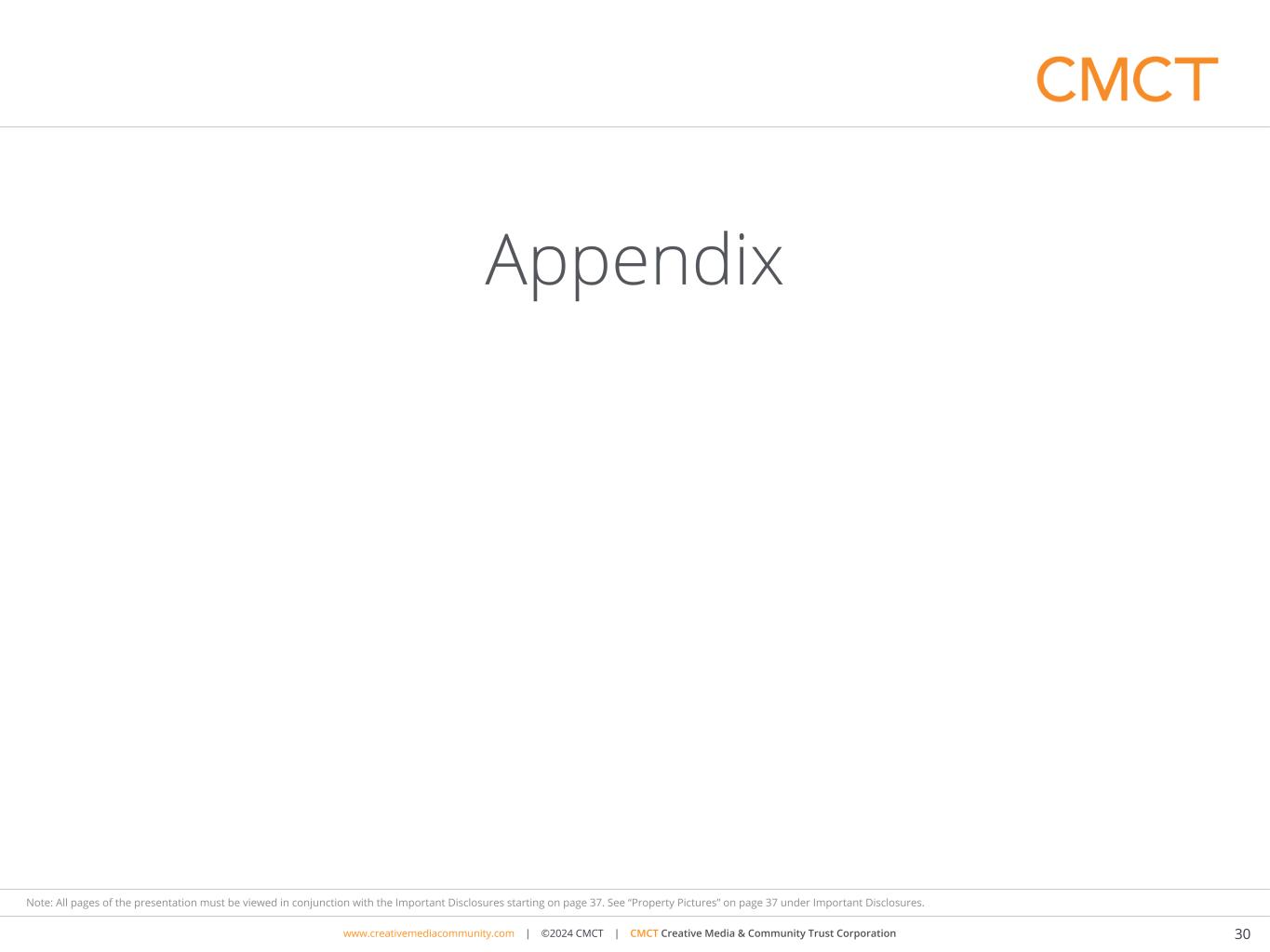 www.cimgroup.com | ©2018 CIM Group | TRADE SECRET / CONFIDENTIAL INFORMATIONwww.creativemediacommunity.com | ©2024 CMCT | CMCT Creative Media & Community Trust Corporation 30 Note: All pages of the presentation must be viewed in conjunction with the Important Disclosures starting on page 37. See “Property Pictures” on page 37 under Important Disclosures. Appendix