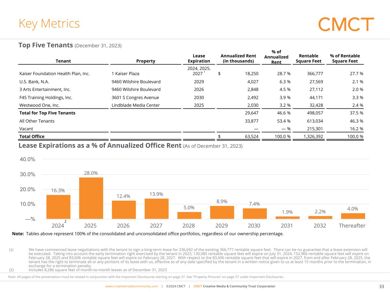 www.cimgroup.com | ©2018 CIM Group | TRADE SECRET / CONFIDENTIAL INFORMATIONwww.creativemediacommunity.com | ©2024 CMCT | CMCT Creative Media & Community Trust Corporation 33 Note: All pages of the presentation must be viewed in conjunction with the Important Disclosures starting on page 37. See “Property Pictures” on page 37 under Important Disclosures. Key Metrics Lease Expirations as a % of Annualized Office Rent (As of December 31, 2023) Top Five Tenants (December 31, 2023) (1) We have commenced lease negotiations with the tenant to sign a long-term lease for 236,692 of the existing 366,777 rentable square feet. There can be no guarantee that a lease extension will be executed. Taking into account the early termination right exercised by the tenant in 2023, 130,085 rentable square feet will expire on July 31, 2024, 152,966 rentable square feet will expire on February 28, 2025 and 83,696 rentable square feet will expire on February 28, 2027. With respect to the 83,696 rentable square feet that will expire in 2027, from and after February 28, 2025, the tenant has the right to terminate all or any portions of its lease with us, effective as of any date specified by the tenant in a written notice given to us at least 15 months prior to the termination, in exchange for a termination penalty. (2) Includes 8,286 square feet of month-to-month leases as of December 31, 2023 16.3% 28.0% 12.4% 13.9% 5.0% 8.9% 7.4% 1.9% 2.2% 4.0% 2024 2025 2026 2027 2028 2029 2030 2031 2032 Thereafter —% 10.0% 20.0% 30.0% 40.0% Tenant Property Lease Expiration Annualized Rent (in thousands) % of Annualized Rent Rentable Square Feet % of Rentable Square Feet Kaiser Foundation Health Plan, Inc. 1 Kaiser Plaza 2024, 2025, 2027 1 $ 18,250 28.7 % 366,777 27.7 % U.S. Bank, N.A. 9460 Wilshire Boulevard 2029 4,027 6.3 % 27,569 2.1 % 3 Arts Entertainment, Inc. 9460 Wilshire Boulevard 2026 2,848 4.5 % 27,112 2.0 % F45 Training Holdings, Inc. 3601 S Congres Avenue 2030 2,492 3.9 % 44,171 3.3 % Westwood One, Inc. Lindblade Media Center 2025 2,030 3.2 % 32,428 2.4 % Total for Top Five Tenants 29,647 46.6 % 498,057 37.5 % All Other Tenants 33,877 53.4 % 613,034 46.3 % Vacant — — % 215,301 16.2 % Total Office $ 63,524 100.0 % 1,326,392 100.0 % 2 Note: Tables above represent 100% of the consolidated and unconsolidated office portfolios, regardless of our ownership percentage.