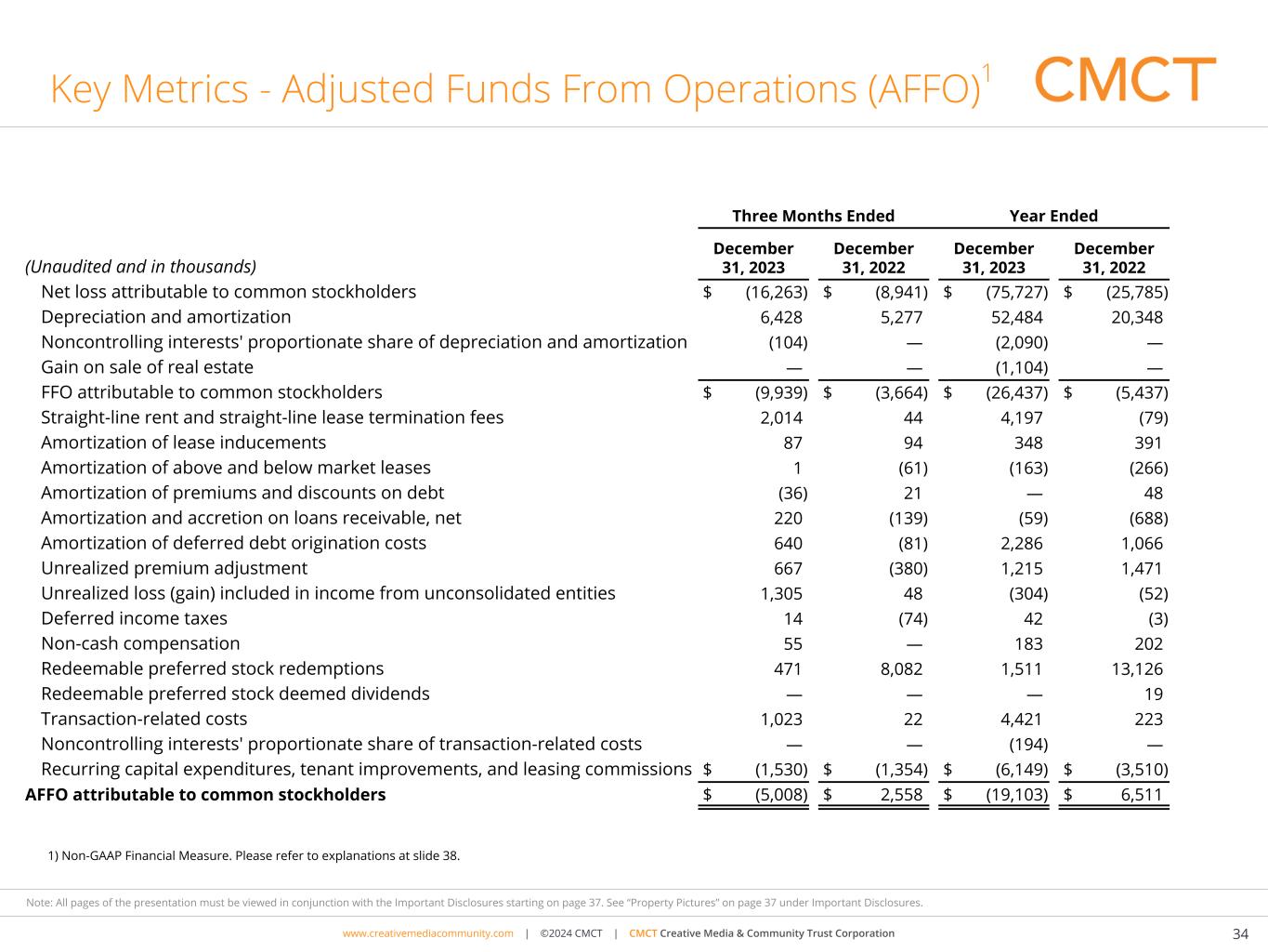 www.cimgroup.com | ©2018 CIM Group | TRADE SECRET / CONFIDENTIAL INFORMATIONwww.creativemediacommunity.com | ©2024 CMCT | CMCT Creative Media & Community Trust Corporation 34 Note: All pages of the presentation must be viewed in conjunction with the Important Disclosures starting on page 37. See “Property Pictures” on page 37 under Important Disclosures. Key Metrics - Adjusted Funds From Operations (AFFO)1 Three Months Ended Year Ended (Unaudited and in thousands) December 31, 2023 December 31, 2022 December 31, 2023 December 31, 2022 Net loss attributable to common stockholders $ (16,263) $ (8,941) $ (75,727) $ (25,785) Depreciation and amortization 6,428 5,277 52,484 20,348 Noncontrolling interests' proportionate share of depreciation and amortization (104) — (2,090) — Gain on sale of real estate — — (1,104) — FFO attributable to common stockholders $ (9,939) $ (3,664) $ (26,437) $ (5,437) Straight-line rent and straight-line lease termination fees 2,014 44 4,197 (79) Amortization of lease inducements 87 94 348 391 Amortization of above and below market leases 1 (61) (163) (266) Amortization of premiums and discounts on debt (36) 21 — 48 Amortization and accretion on loans receivable, net 220 (139) (59) (688) Amortization of deferred debt origination costs 640 (81) 2,286 1,066 Unrealized premium adjustment 667 (380) 1,215 1,471 Unrealized loss (gain) included in income from unconsolidated entities 1,305 48 (304) (52) Deferred income taxes 14 (74) 42 (3) Non-cash compensation 55 — 183 202 Redeemable preferred stock redemptions 471 8,082 1,511 13,126 Redeemable preferred stock deemed dividends — — — 19 Transaction-related costs 1,023 22 4,421 223 Noncontrolling interests' proportionate share of transaction-related costs — — (194) — Recurring capital expenditures, tenant improvements, and leasing commissions $ (1,530) $ (1,354) $ (6,149) $ (3,510) AFFO attributable to common stockholders $ (5,008) $ 2,558 $ (19,103) $ 6,511 1) Non-GAAP Financial Measure. Please refer to explanations at slide 38.