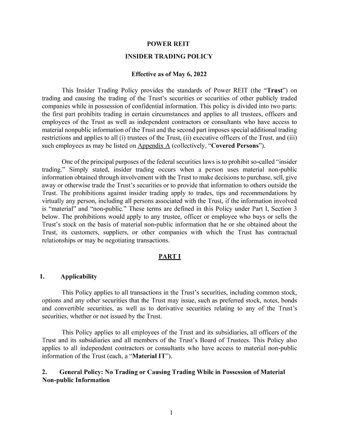 This Annual Report on Form 10-K (this “Annual Report”) contains forward-looking statements within the meaning of the Securities Act of 1933, as amended (the “Securities Act”), and the Securities Exchange Act of 1934, as amended (the “Exchange Act”). Forward-looking statements are those that predict or describe future events or trends and that do not relate solely to historical matters. You can generally identify forward-looking statements by the use of words such as “believe,” “expect,” “will,” “anticipate,” “intend,” “estimate,” “would,” “should,” “project,” “plan,” “assume” or other similar words or expressions, or negatives of such words or expressions, although not all forward-looking statements can be identified in this way. All statements contained in this document regarding strategy, plans, future operations, projected financial condition or results of operations, prospects, the future of Power REIT’s industries and markets, outcomes that might be obtained by pursuing management’s plans and objectives, and similar subjects, are forward-looking statements. Over time, Power REIT’s actual performance, results, financial condition and achievements may differ from the anticipated performance, results, financial condition and achievements that are expressed or implied by Power REIT’s forward-looking statements, and such differences may be significant and materially adverse to Power REIT and its security holders.