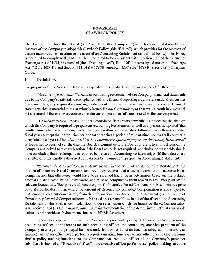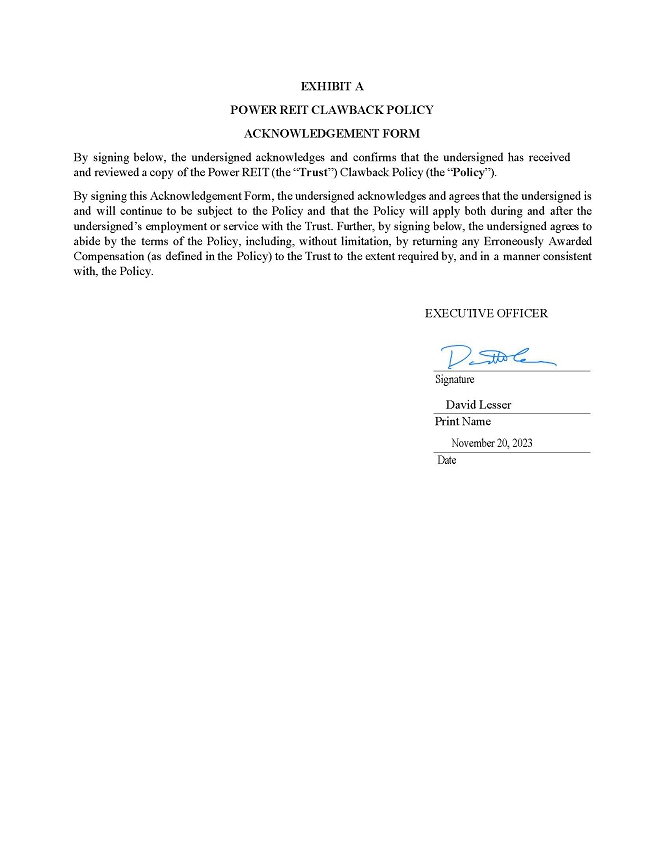 In connection with the annual report of Power REIT (the “registrant”) on Form 10-K for the period ending December 31, 2023 as furnished with the Securities and Exchange Commission on the date hereof (the “Report”), I, David H. Lesser, Chairman, Chief Executive Officer, Secretary and Treasurer, certify, to the best of my knowledge, pursuant to 18 U.S.C. Section 1350, as adopted pursuant to Section 906 of the Sarbanes-Oxley Act of 2002, that: