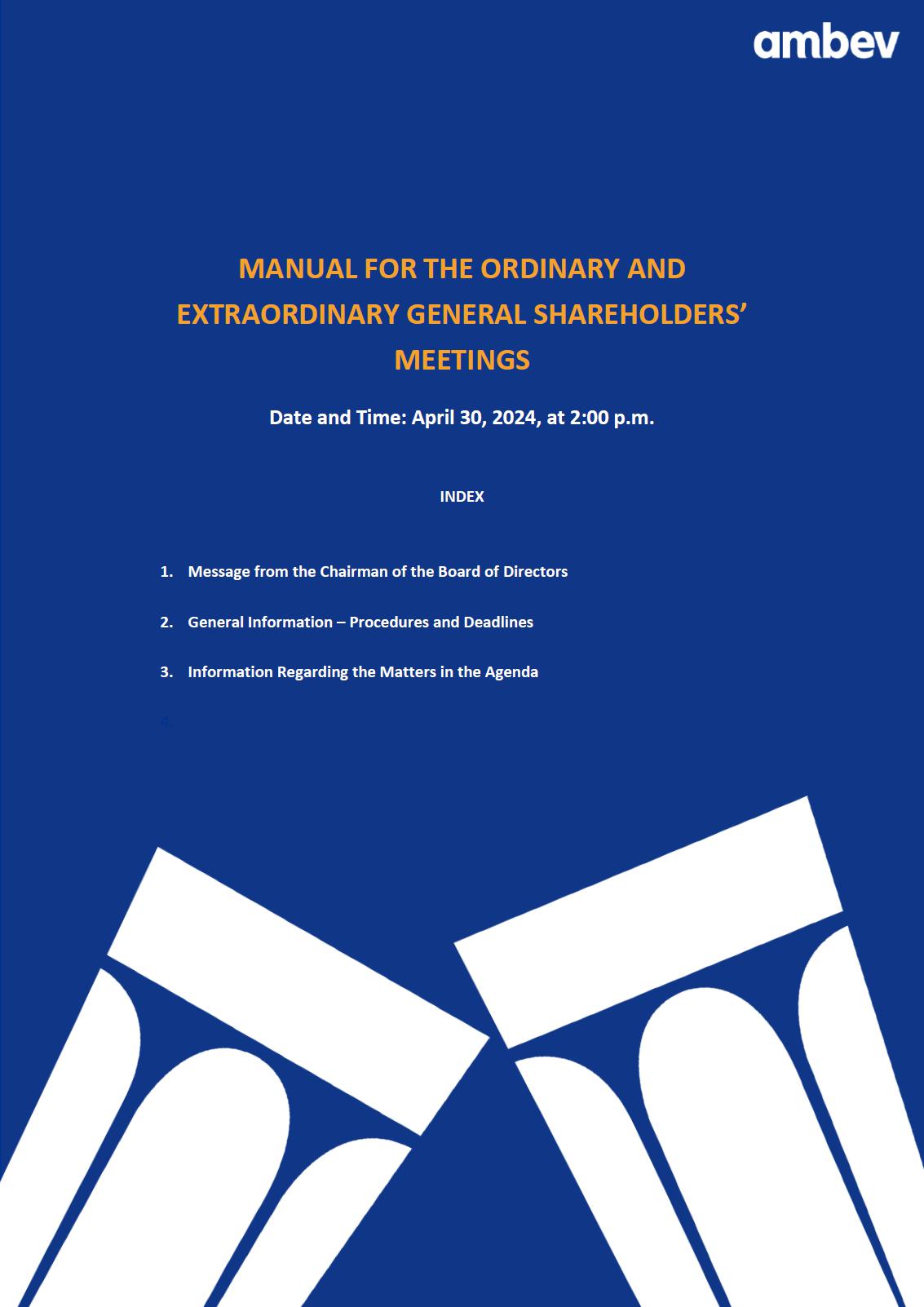 We are delighted to invite you to read our Manual (“Manual”) for the Ordinary and Extraordinary General Shareholders’ Meetings of Ambev S.A. (“Company”) to be held, cumulatively, on April 30, 2024, at 2:00 p.m., in an exclusively digital form, through Ten Meetings digital platform (“Digital Platform”), to be considered held, for the purposes of article 5, § 2, item I, § 3, and article 28, §§ 2 and 3, of the Brazilian Securities Commission (“CVM”) Resolution No. 81, of March 29, 2022 (“CVM Resolution 81/22”), at the Company’s headquarters (“AGOE” or “Shareholders’ Meetings”).