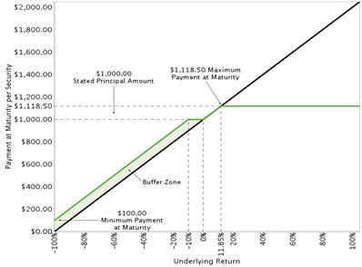 You will receive at maturity for each security you then hold: § If the final underlying value is greater than the initial underlying value: $1,000 + the return amount, subject to the maximum return at maturity § If the final underlying value is less than or equal to the initial underlying value but greater than or equal to the final buffer value: $1,000 § If the final underlying value is less than the final buffer value: $1,000 + [$1,000 × (the underlying return + the buffer percentage)] If the final underlying value is less than the final buffer value, which means that the underlying has depreciated from the initial underlying value by more than the buffer percentage, you will lose 1% of the stated principal amount of your securities at maturity for every 1% by which that depreciation exceeds the buffer percentage. | ||
