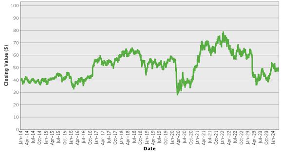 | SPDR® S&P® Regional Banking ETF – Historical Closing Values January 2, 2014 to March 27, 2024 |