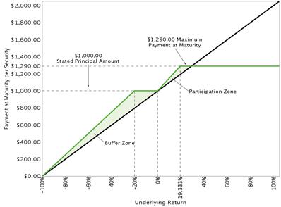 You will receive at maturity for each security you then hold: § If the final underlying value is greater than the initial underlying value: $1,000 + the return amount, subject to the maximum return at maturity § If the final underlying value is less than or equal to the initial underlying value but greater than or equal to the final buffer value: $1,000 § If the final underlying value is less than the final buffer value: $1,000 + [$1,000 × the buffer rate × (the underlying return + the buffer percentage)] If the final underlying value is less than the final buffer value, which means that the underlying has depreciated from the initial underlying value by more than the buffer percentage, you will lose more than 1% of the stated principal amount of your securities at maturity for every 1% by which that depreciation exceeds the buffer percentage. Accordingly, the lower the final underlying value, the less benefit you will receive from the buffer. |