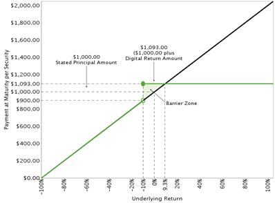 | Digital return amount: | $93.00 per security (representing a digital return equal to 9.30% of the stated principal amount). You will receive the digital return amount only if the final underlying value is greater than or equal to the final barrier value. |