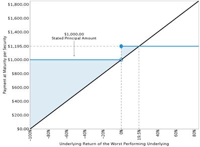 The diagram below illustrates your payment at maturity of the securities, assuming the securities have not previously been automatically redeemed, for a range of hypothetical underlying returns of the worst performing underlying on the final valuation date. Your payment at maturity (if the securities are not earlier automatically redeemed) will be determined based solely on the performance of the worst performing underlying on the final valuation date.