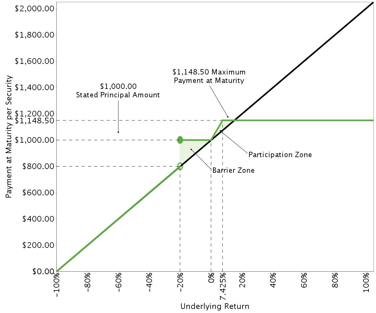 The securities offer modified exposure to the performance of the underlying, with (i) the opportunity to participate in a limited range of potential appreciation of the underlying at the upside participation rate specified below and (ii) contingent repayment of the stated principal amount at maturity if the underlying depreciates, but only so long as the final underlying value is greater than or equal to the final barrier value specified below. In exchange for these features, investors in the securities must be willing to forgo any appreciation of the underlying in excess of the maximum return at maturity specified below and must be willing to forgo any dividends with respect to the underlying. In addition, investors in the securities must be willing to accept full downside exposure to the depreciation of the underlying if the final underlying value is less than the final barrier value. If the final underlying value is less than the final barrier value, you will lose 1% of the stated principal amount of your securities for every 1% by which the final underlying value is less than the initial underlying value. You may lose your entire investment in the securities.