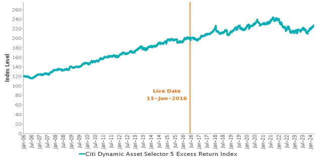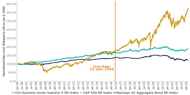 | Citi Dynamic Asset Selector 5 Excess Return Index | S&P 500 Index (ER) | Barclays U.S. Aggregate Bond Index (ER) | |