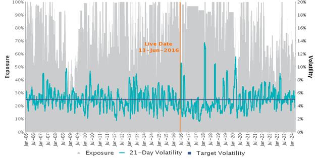 The following graph indicates the hypothetical back-tested rolling 21-Day Realized Volatility and the exposure that the Index has to the performance of the Selected Portfolio at any time from January 1, 2006 to June 12, 2016. The historical rolling 21-Day Realized Volatility and the exposure are shown for the period from June 13, 2016 to March 27, 2024. The hypothetical back-tested 21-Day Realized Volatility and past exposure levels of the Index shown below are subject to the significant limitations on hypothetical back-tested Index information discussed above. The hypothetical back-tested and historical data alike may not be indicative of future volatility and exposure levels.