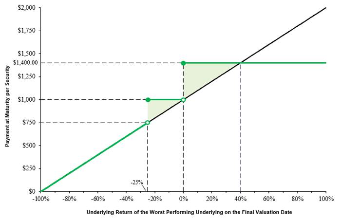 The diagram below illustrates the payment at maturity of the securities, assuming the securities have not previously been automatically redeemed, for a range of hypothetical underlying returns of the worst performing underlying on the final valuation date. Your payment at maturity (if the securities are not earlier automatically redeemed) will be determined based solely on the performance of the worst performing underlying on the final valuation date.