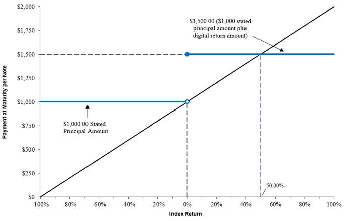 | Digital return amount: | $500.00 per note (representing a digital return equal to 50.00% of the stated principal amount). You will receive the digital return amount only if the final index level is greater than or equal to the initial index level. | ||