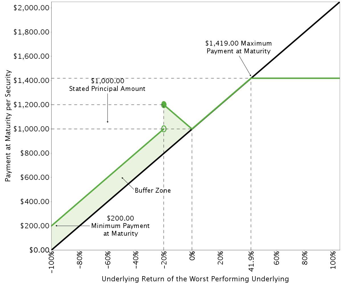 You may lose a significant portion of your investment. Unlike conventional debt securities, the securities do not repay a fixed amount of principal at maturity. Instead, your payment at maturity will depend on the performance of the worst performing underlying. If the worst performing underlying depreciates by more than the buffer percentage from its initial underlying value to its final underlying value, you will lose 1% of the stated principal amount of your securities for every 1% by which that depreciation exceeds the buffer percentage.