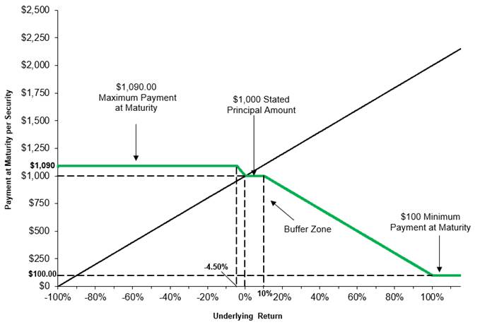 You will receive at maturity for each security you then hold: § If the final underlying value is less than the initial underlying value: $1,000 + the return amount, subject to the maximum return at maturity § If the final underlying value is greater than or equal to the initial underlying value but less than or equal to the final buffer value: $1,000 § If the final underlying value is greater than the final buffer value: $1,000 - [$1,000 × (the underlying return - the buffer percentage)], subject to the minimum payment at maturity If the final underlying value is greater than the final buffer value, which means that the underlying has appreciated from the initial underlying value by more than the buffer percentage, you will lose 1% of the stated principal amount of your securities at maturity for every 1% by which that appreciation exceeds the buffer percentage, subject to the minimum payment at maturity. | ||