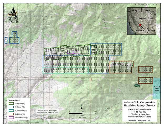 Excelsior Springs is Athena Gold’s flagship property, which is located in the southern portion of the Walker Lane. The Excelsior Springs project has been explored by a number of companies over the past 30 years. The target is a large tonnage, moderate grade gold deposit amenable to open pit mining. The Company was granted a drilling and exploration permit (the “Drill Permit”) by the BLM at the Excelsior Springs project in Esmeralda County, Nevada (the “Excelsior Springs Project”). A drilling contractor was engaged and a Phase One RC drill program consisting of 5,575 feet (11 holes) Reverse Circulation (“RC”) drilling program was completed in early April 2022. A Phase Two RC drill program consisting of 2,700 feet (9 holes) was completed in October 2022. A Phase Three RC drill program consisting of 3,740 feet (9 holes) was completed in June 2023. Additional drill programs are planned, subject to sufficient capital being raised.
