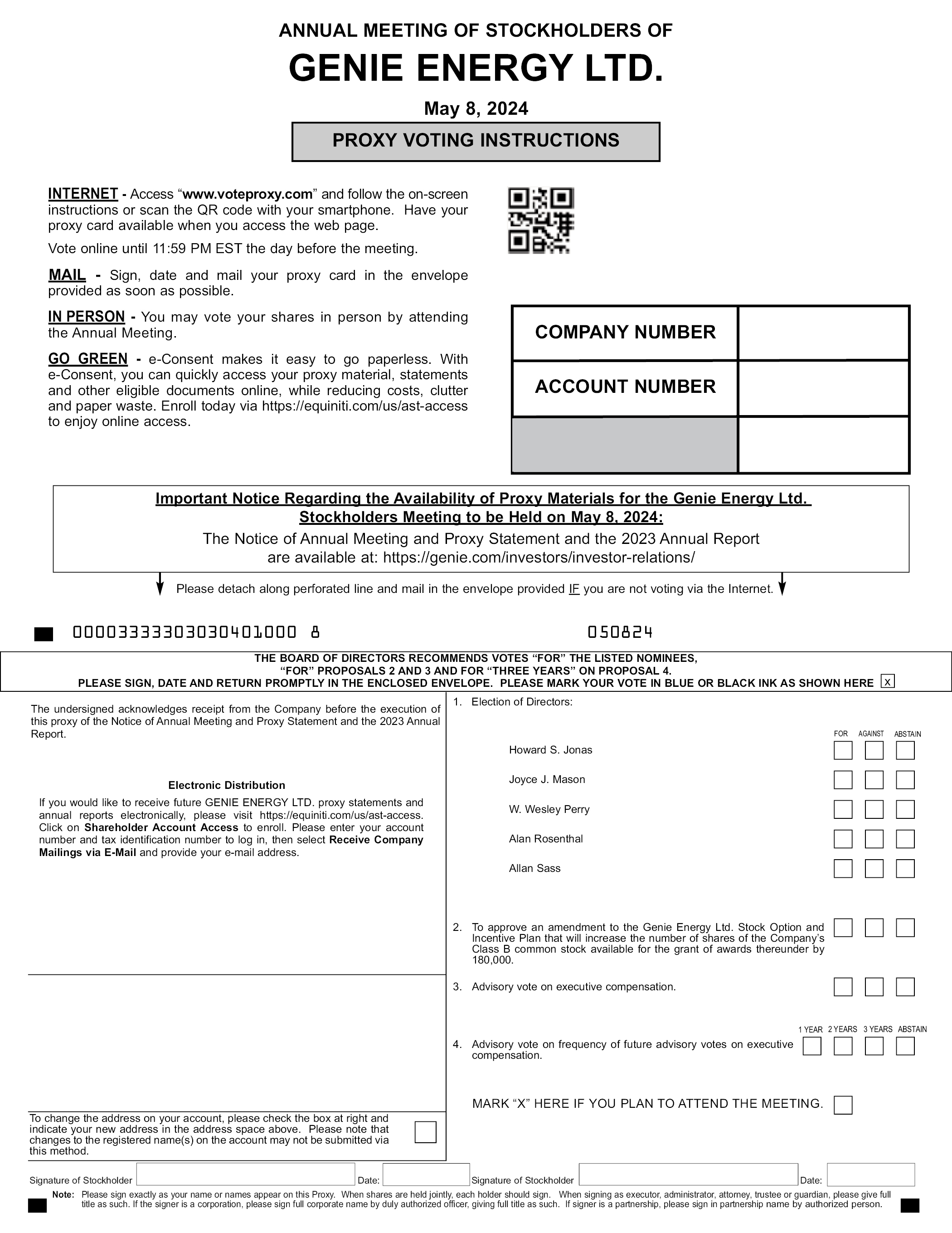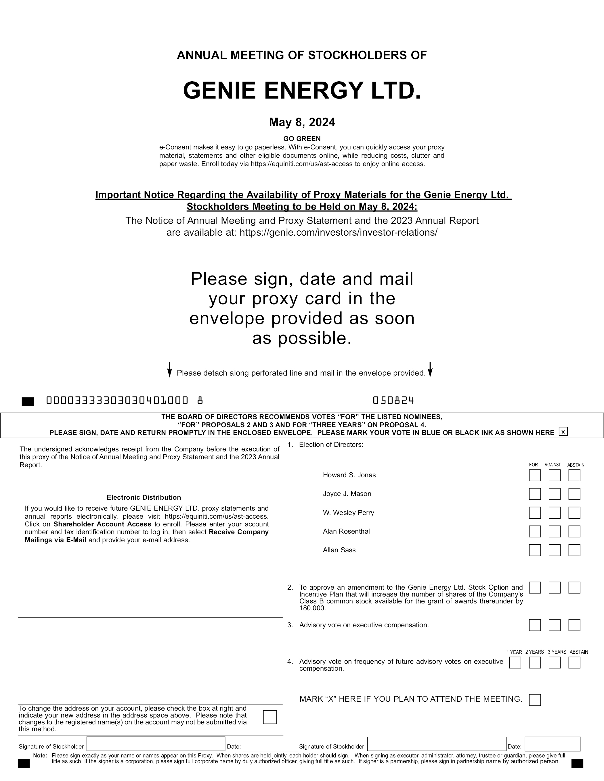 ANNUAL MEETING OF STOCKHOLDERS OF GENIE ENERGY LTD. May 8, 2024 e-Consent makes it easy to go paperless. With e-Consent, you can quickly access your proxy material, statements and other eligible documents online, while reducing costs, clutter and paper waste. Enroll today via https://equiniti.com/us/ast-access to enjoy online access. Important Notice Regarding the Availability of Proxy Materials for the Genie Energy Ltd. Stockholders Meeting to be Held on May 8, 2024: The Notice of Annual Meeting and Proxy Statement and the 2023 Annual Report are available at: https://genie.com/investors/investor-relations/ Please sign, date and mail your proxy card in the envelope provided as soon as possible. Please detach along perforated line and mail in the envelope provided. 00003333303030401000 050824 THE BOARD OF DIRECTORS RECOMMENDS VOTES “FOR” THE LISTED NOMINEES, “FOR” PROPOSALS 2 AND 3 AND FOR “THREE YEARS” ON PROPOSAL 4. PLEASE SIGN, DATE AND RETURN PROMPTLY IN THE ENCLOSED ENVELOPE. PLEASE MARK YOUR VOTE IN BLUE OR BLACK INK AS SHOWN HERE The undersigned acknowledges receipt from the Company before the execution of this proxy of the Notice of Annual Meeting and Proxy Statement and the 2023 Annual Report. Electronic Distribution If you would like to receive future GENIE ENERGY LTD. proxy statements and annual reports electronically, please visit https://equiniti.com/us/ast-access. Click on Shareholder Account Access to enroll. Please enter your account number and tax identification number to log in, then select Receive Company Mailings via E-Mail and provide your e-mail address. 1. Election of Directors: Howard S. Jonas Joyce J. Mason W. Wesley Perry Alan Rosenthal Allan Sass 2. To approve an amendment to the Genie Energy Ltd. Stock Option and Incentive Plan that will increase the number of shares of the Company’s Class B common stock available for the grant of awards thereunder by 180,000. 3. Advisory vote on executive compensation. 4. Advisory vote on frequency of future advisory votes on executive compensation. 1 YEAR 2 YEARS 3 YEARS ABSTAIN FOR AGAINST ABSTAIN MARK “X” HERE IF YOU PLAN TO ATTEND THE MEETING. To change the address on your account, please check the box at right and indicate your new address in the address space above. Please note that changes to the registered name(s) on the account may not be submitted via this method. Signature of Stockholder Date: Signature of Stockholder Date: Note: Please sign exactly as your name or names appear on this Proxy. When shares are held jointly, each holder should sign. When signing as executor, administrator, attorney, trustee or guardian, please give full title as such. If the signer is a corporation, please sign full corporate name by duly authorized officer, giving full title as such. If signer is a partnership, please sign in partnership name by authorized person.